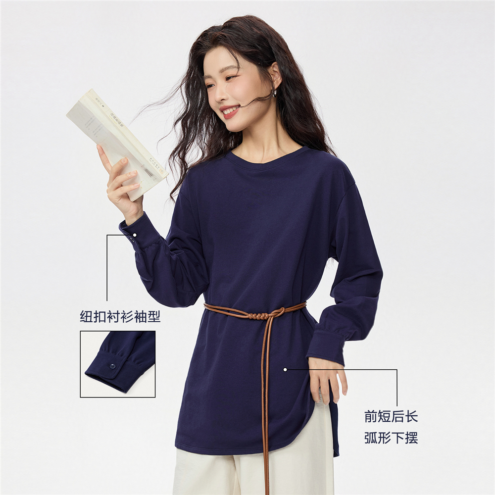 佐丹奴长袖T恤女秋冬新款纯棉圆领衬衫袖中长款宽松上衣13325795