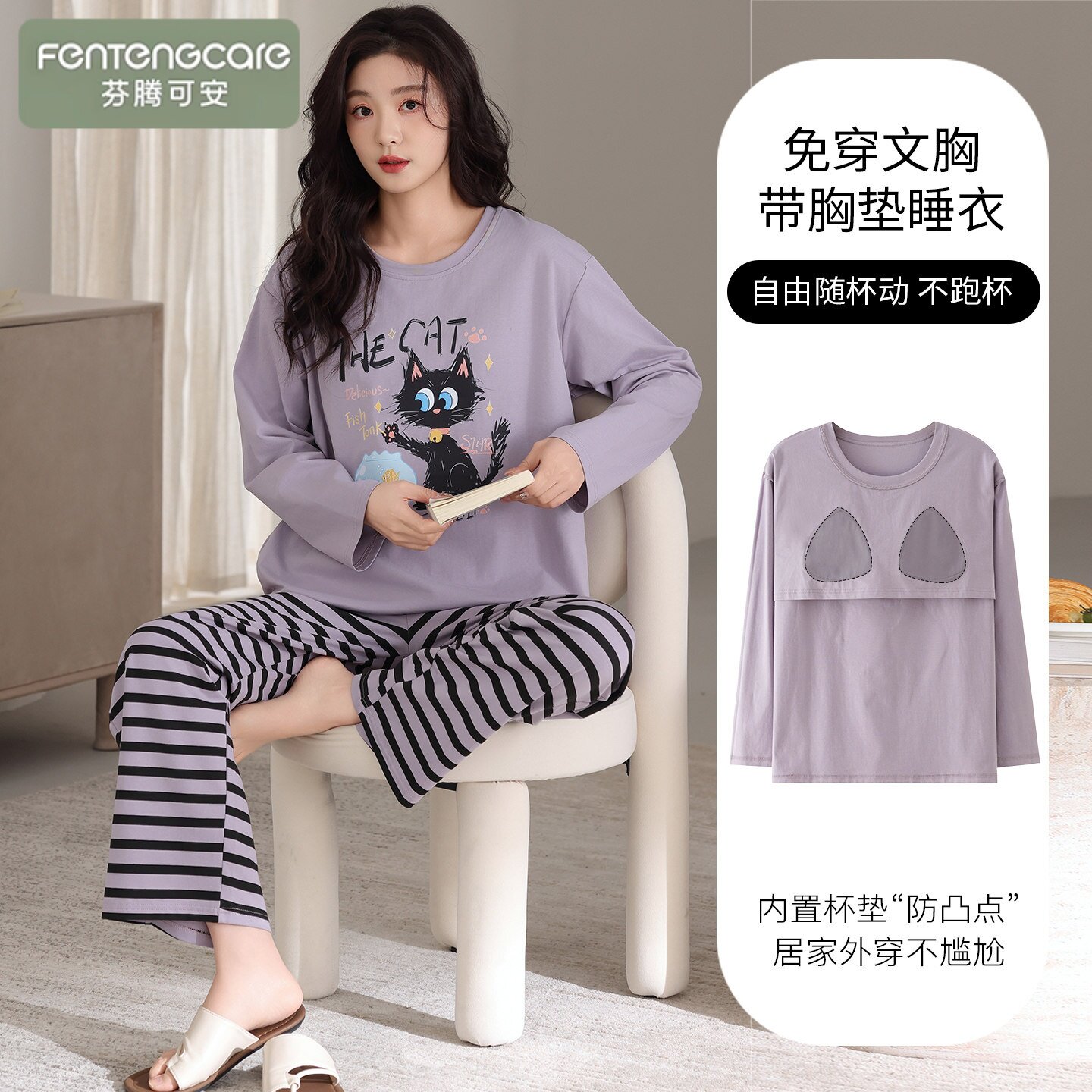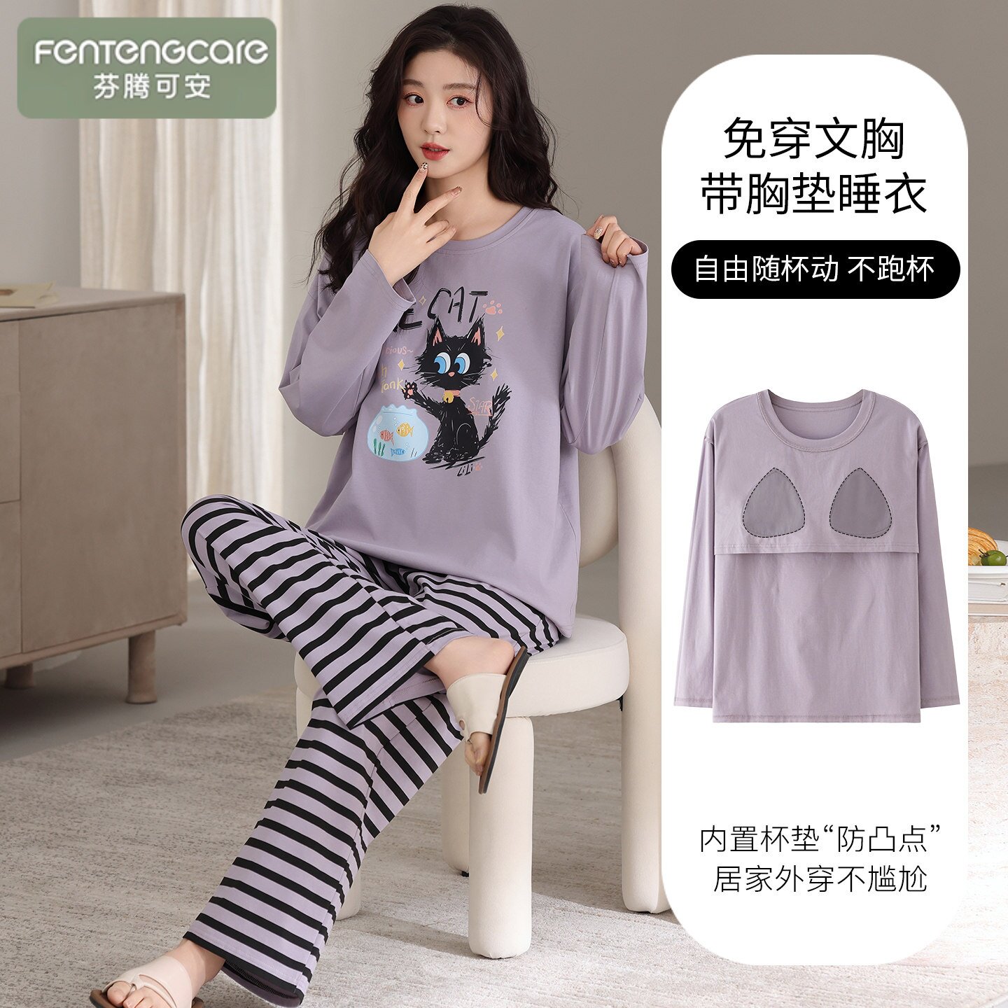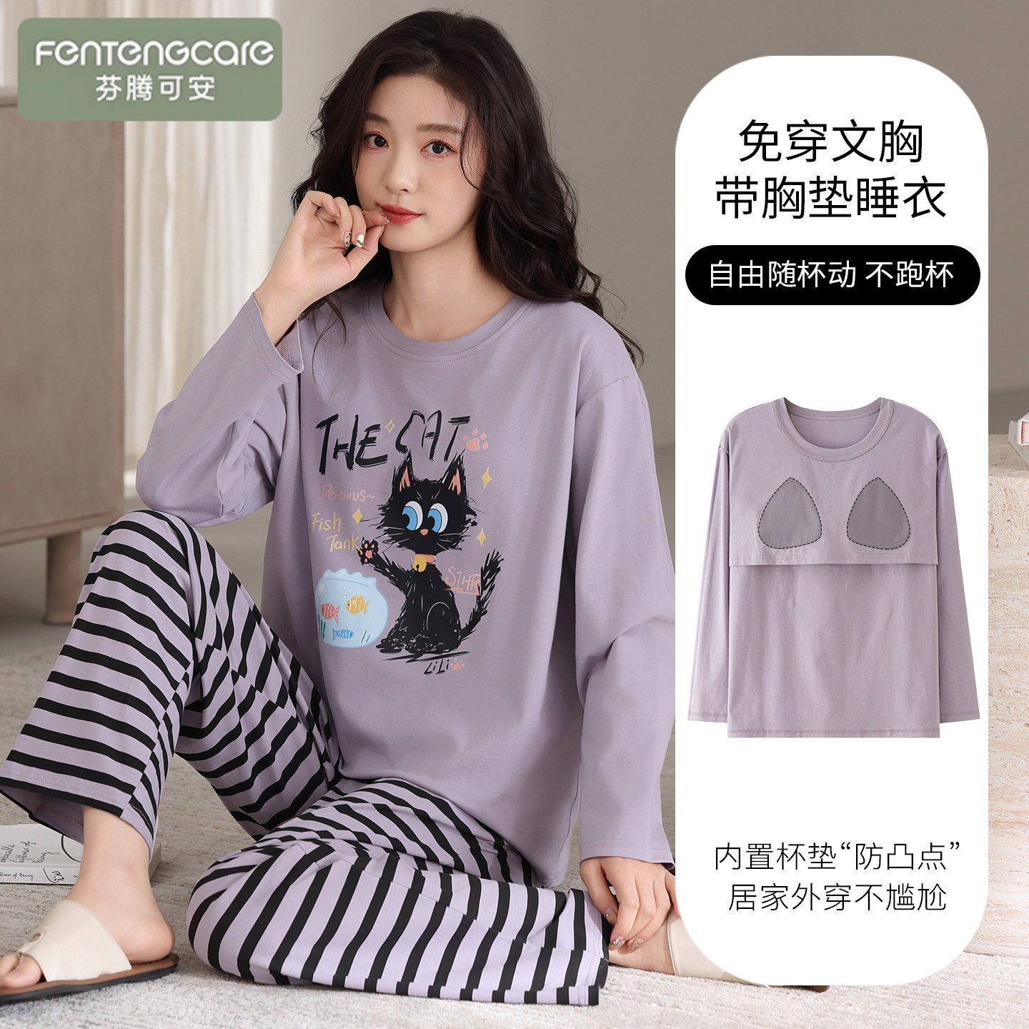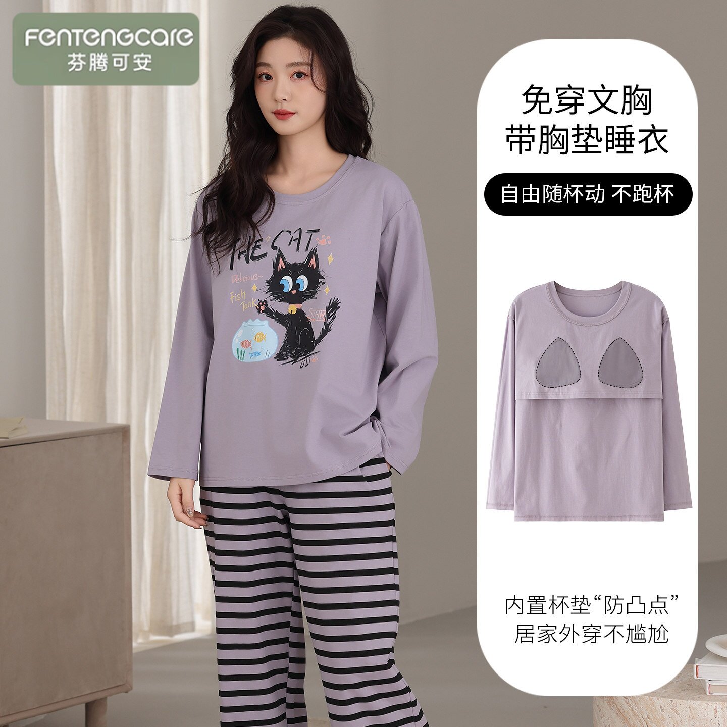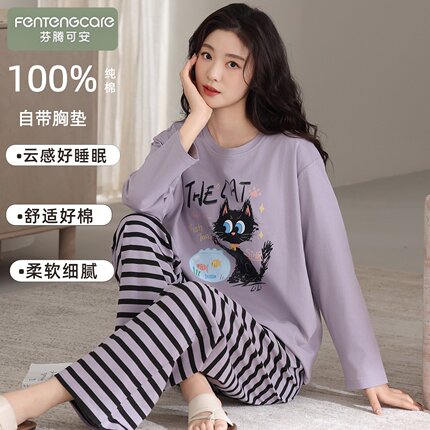 芬腾可安春秋季2026新款纯棉睡衣女生带胸垫长袖可外穿家居服套装