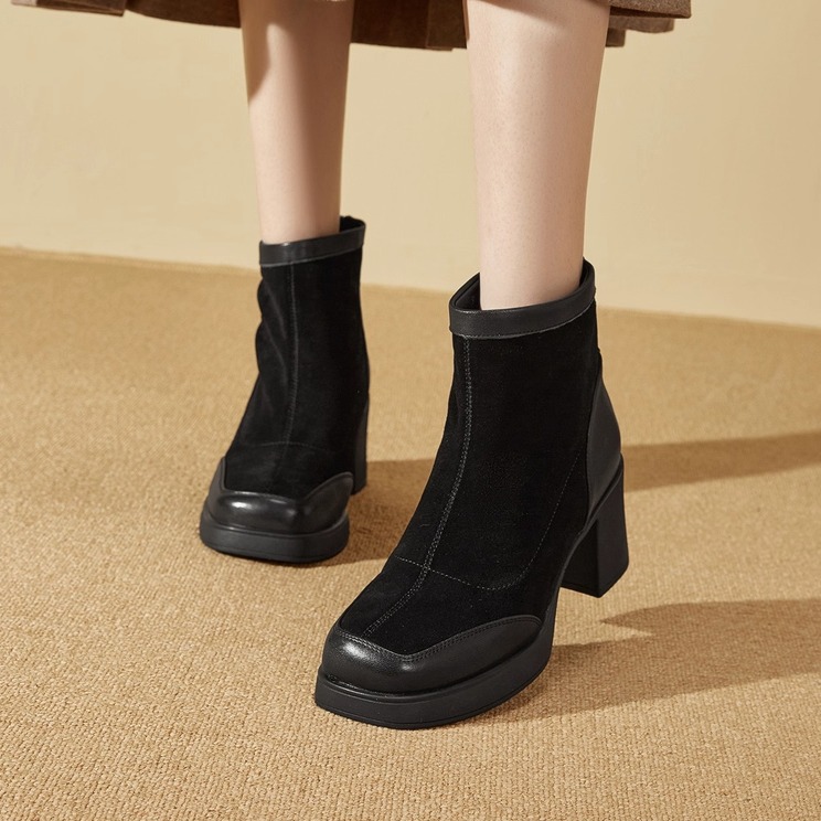 意尔康真皮高跟时装靴女秋冬2025拼接防撞短靴法式中筒瘦瘦靴短靴