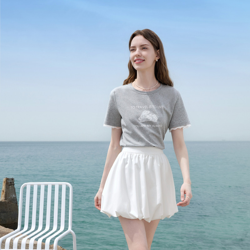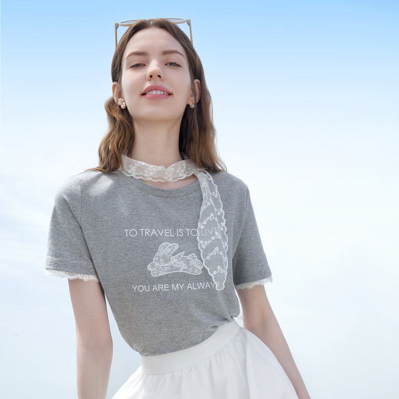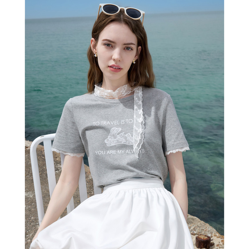 betu百图蕾丝边短袖灰色T恤女2025年夏季新款宽松圆领上衣小衫