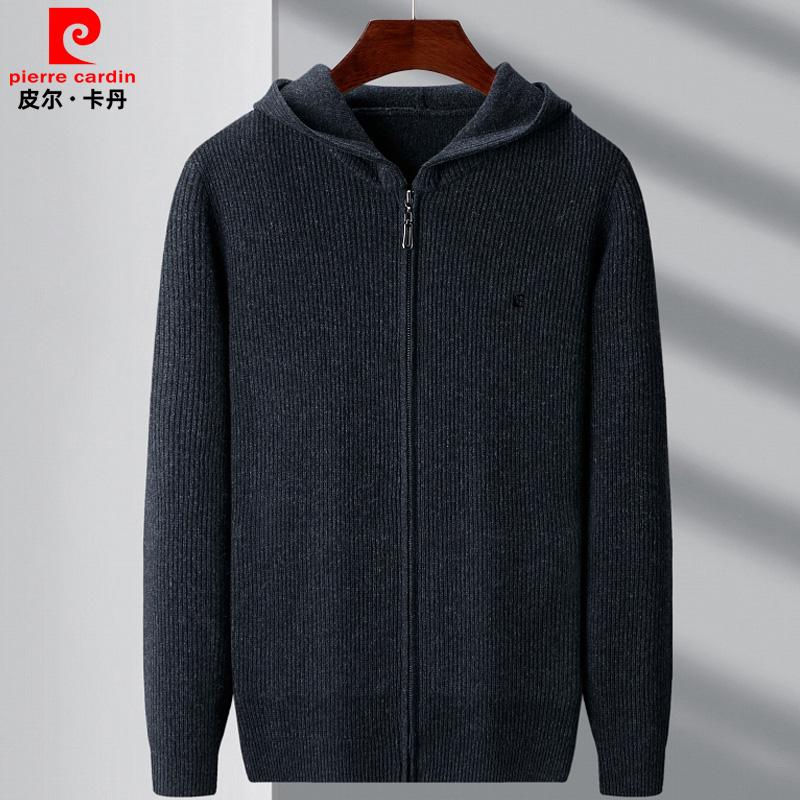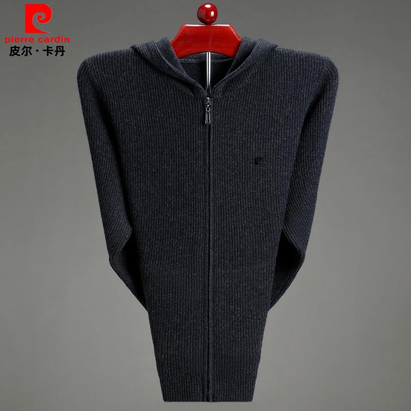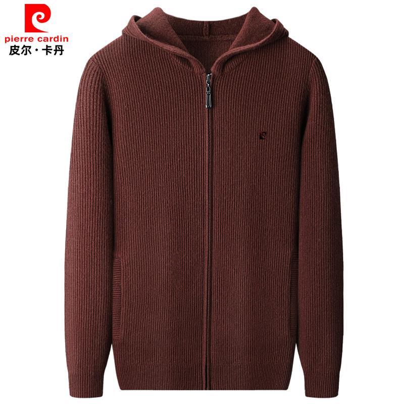 皮尔卡丹羊毛衫男士开衫秋冬款加厚开胸纯羊绒连帽拉链毛衣男外套