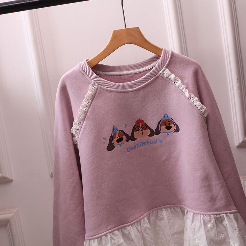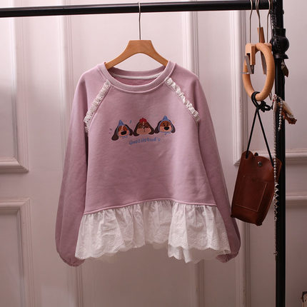 秋冬日系加绒卫衣宽松甜美蕾丝花边拼色减龄百搭套头女上衣大码
