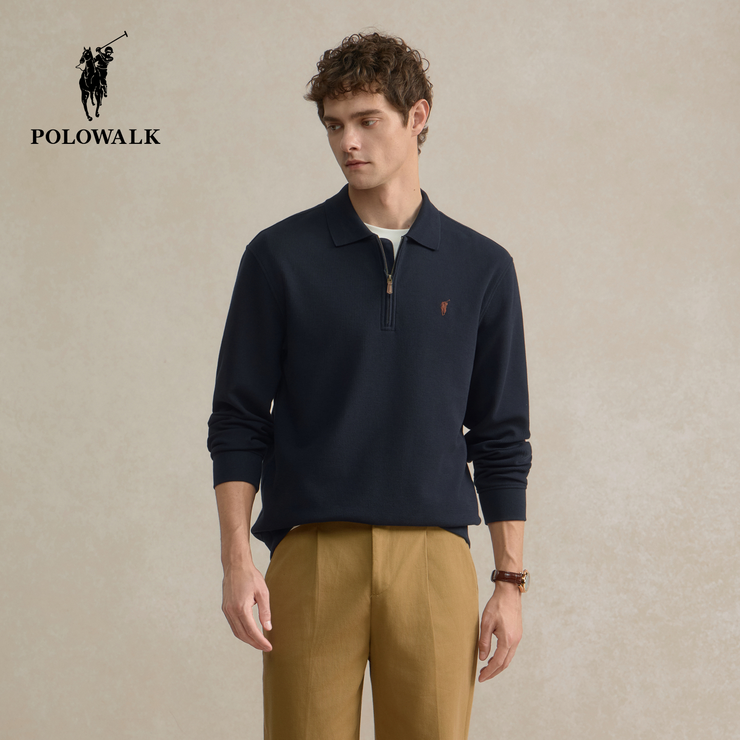 POLOWALK男式卫衣2025秋季新品翻领华夫格半拉链保罗休闲上衣外套