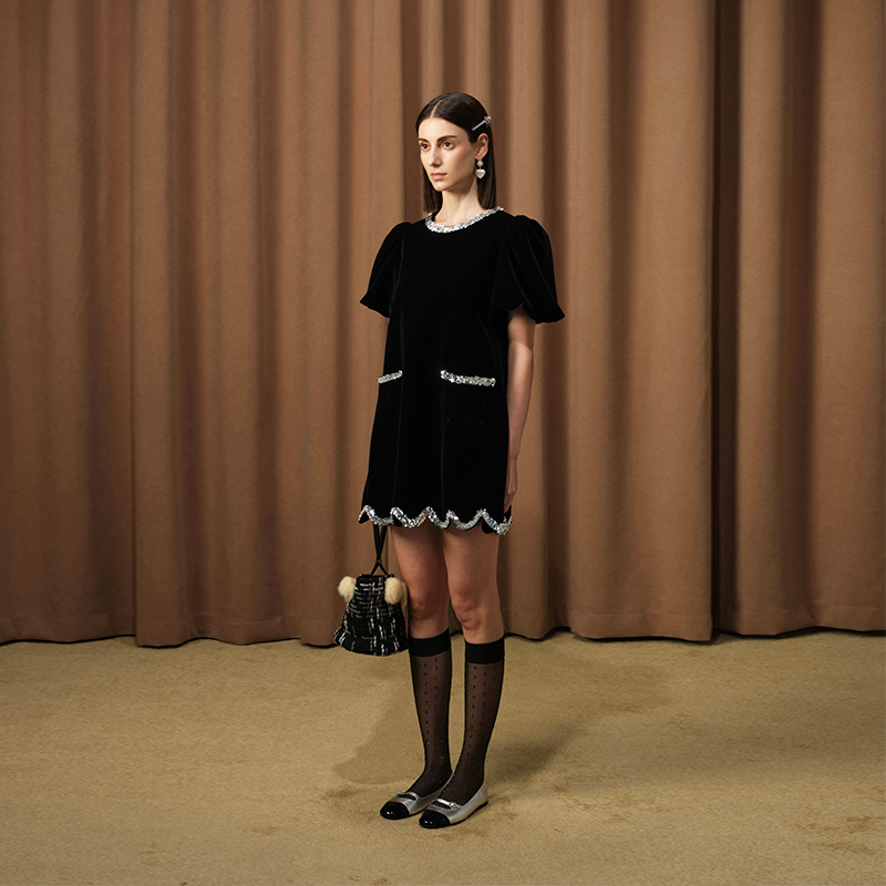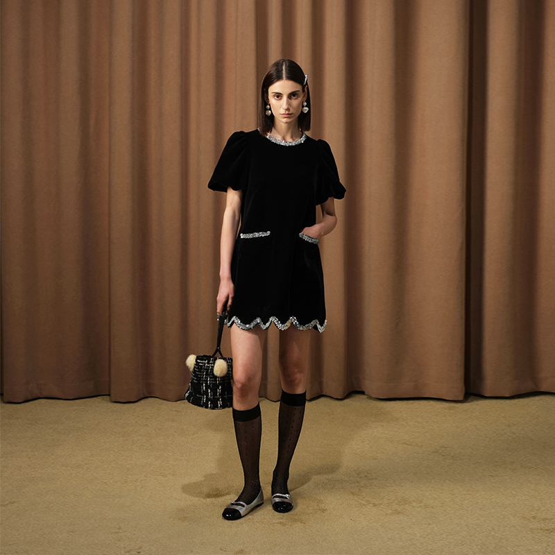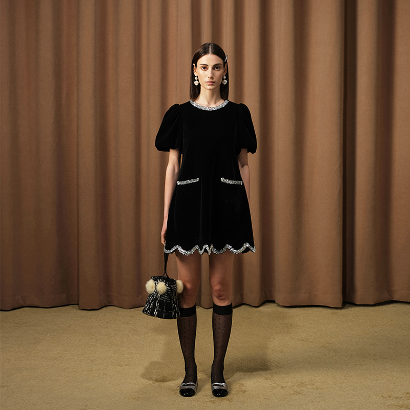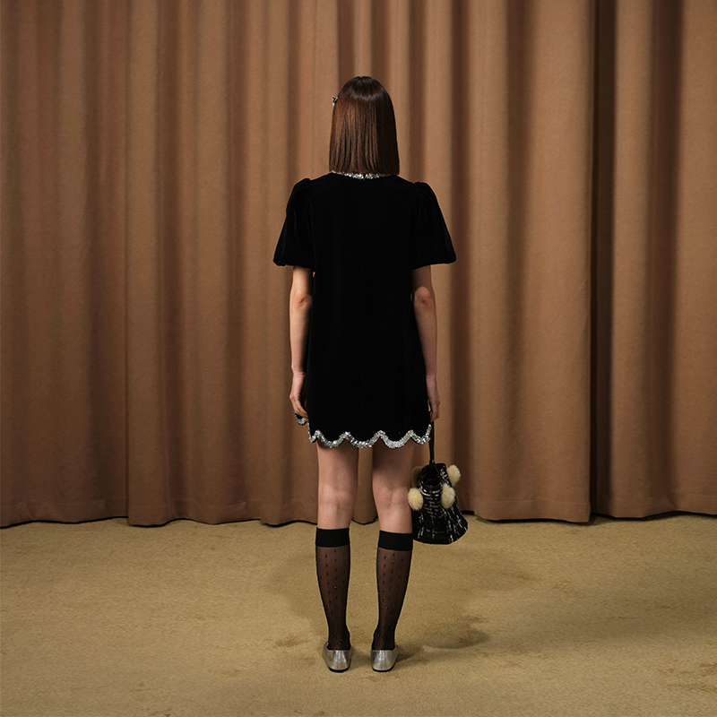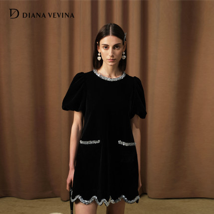 DIANAVEVINA秋冬新款重工珠片泡泡袖丝绒连衣裙A版泡泡袖裙子
