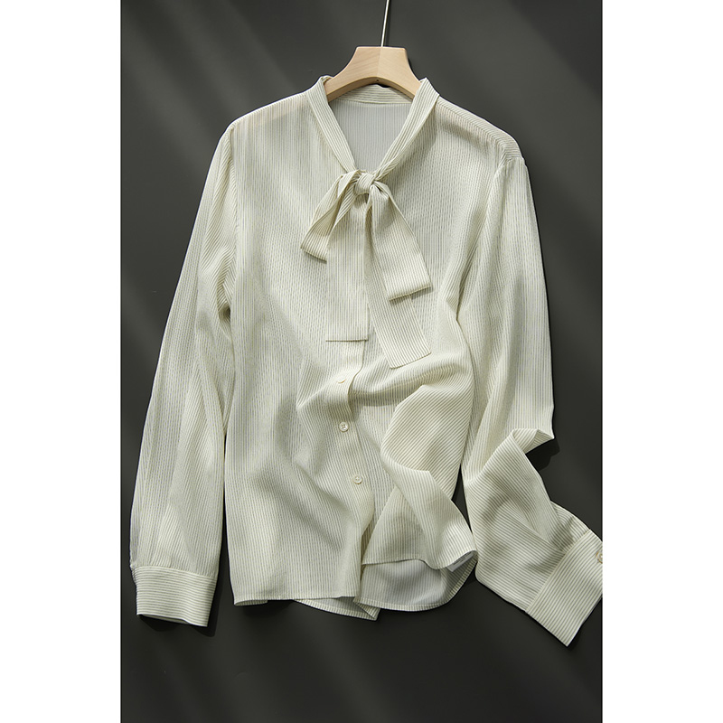 16姆米 女士条纹真丝衬衣立领飘带轻薄桑蚕丝衬衫通勤 春秋款女装