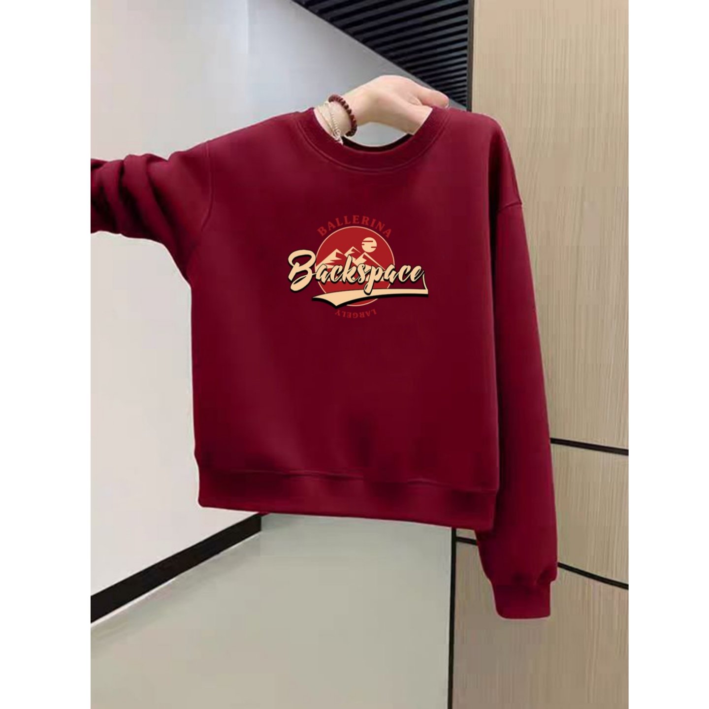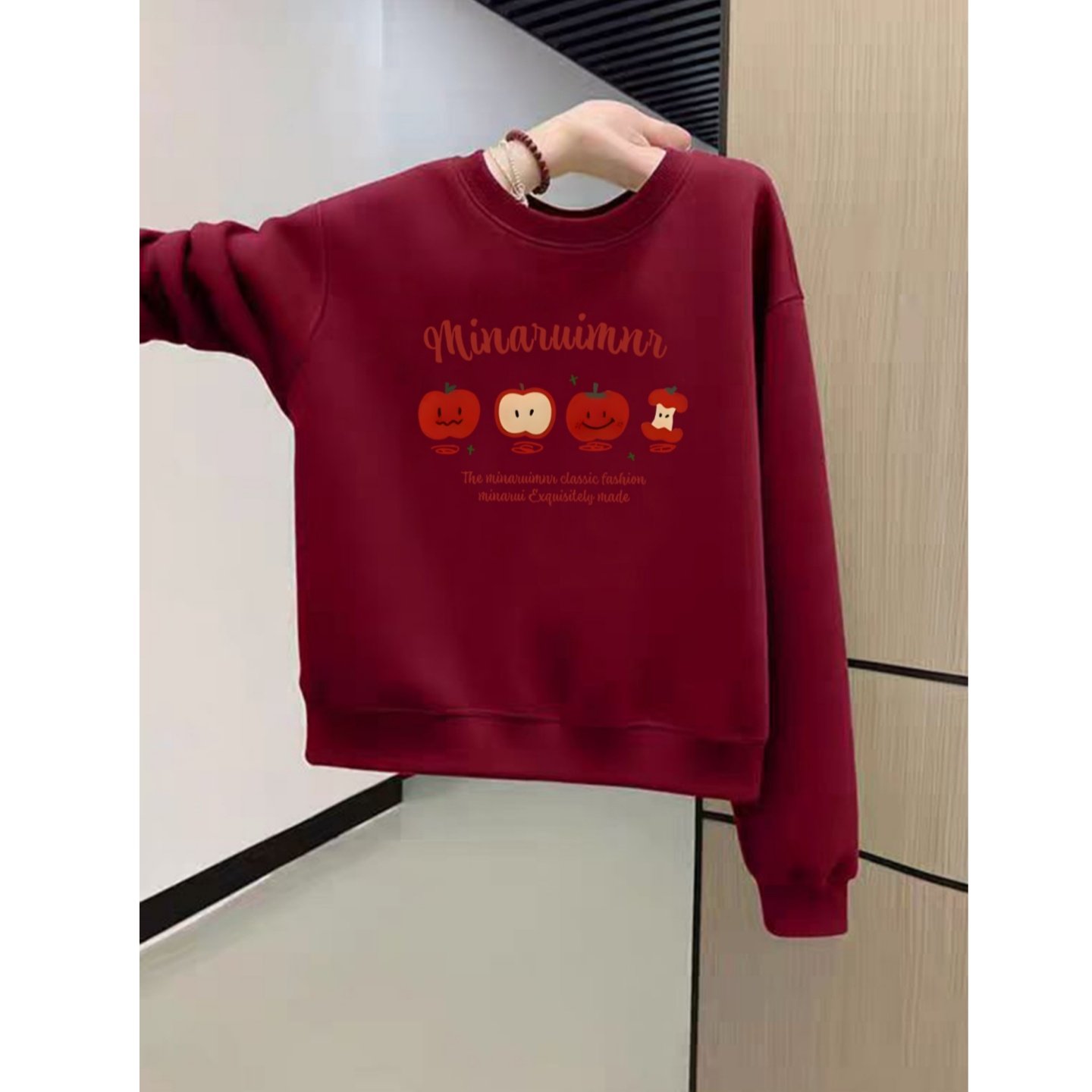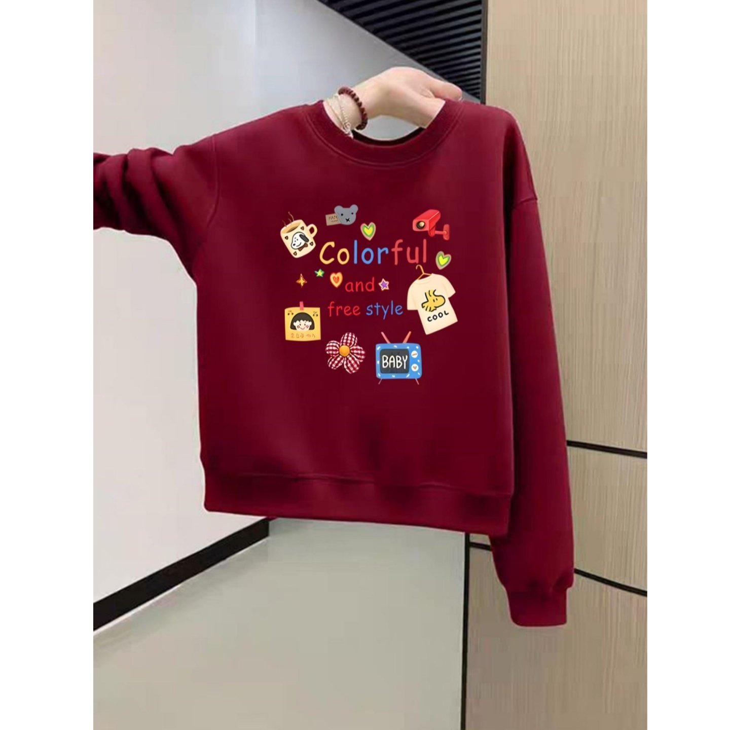 可爱猫咪印花圆领短款卫衣女秋冬保暖加绒加厚宽松酒红色长袖上衣