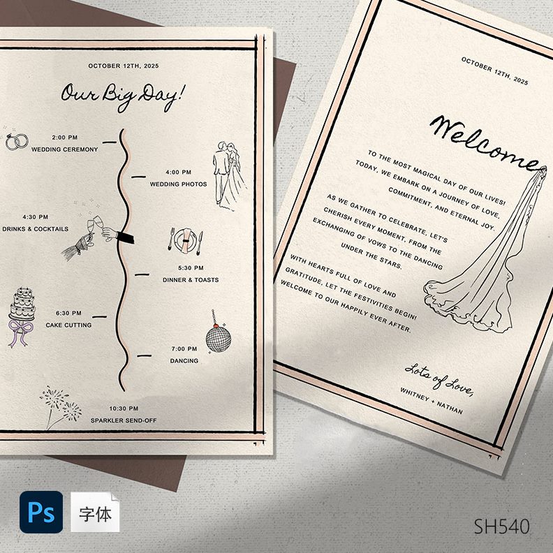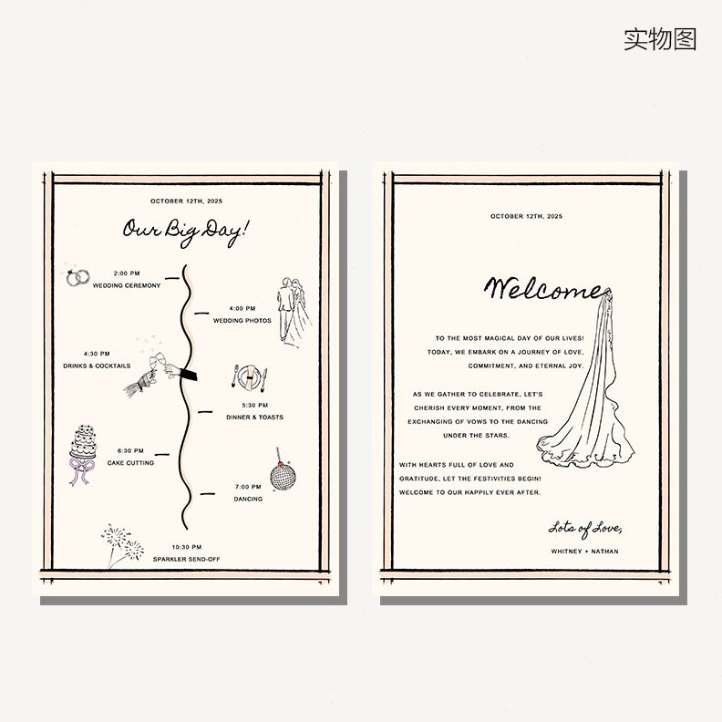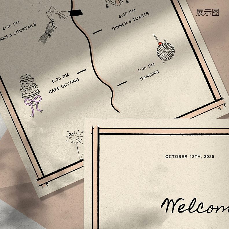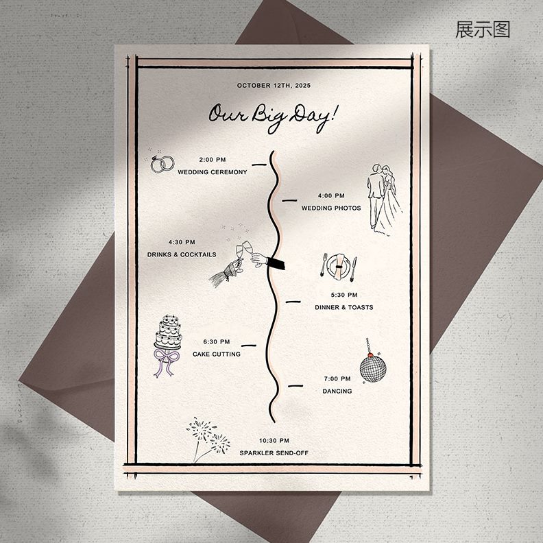 手写复古卡片表彩色婚礼邀请函素材时间手绘模板手写婚礼插图有趣