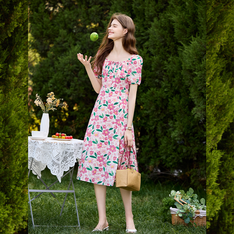 白鹿语浪漫甜美方领碎花裙夏季新款法式复古泡泡短袖修身连衣裙