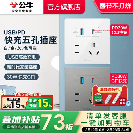 公牛开关插座type-cPD快充USB五孔插座面板苹果充电86型G12