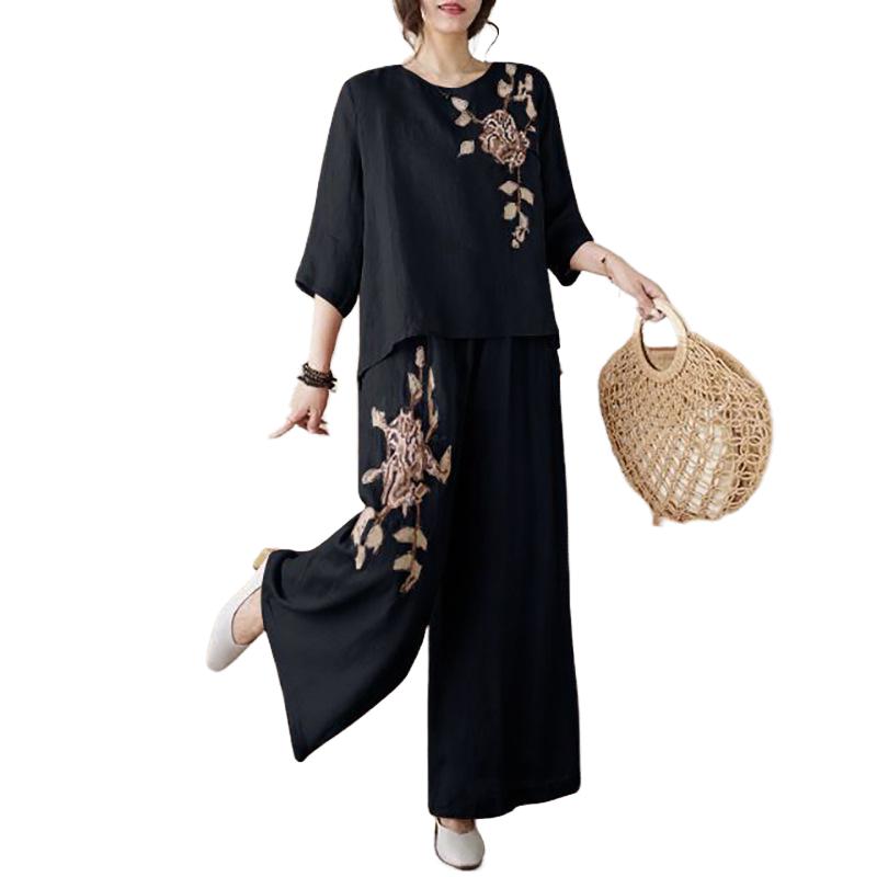 国风复古夏季宽松阔腿裤棉麻时尚套装中袖上衣裤子重工刺绣设计女