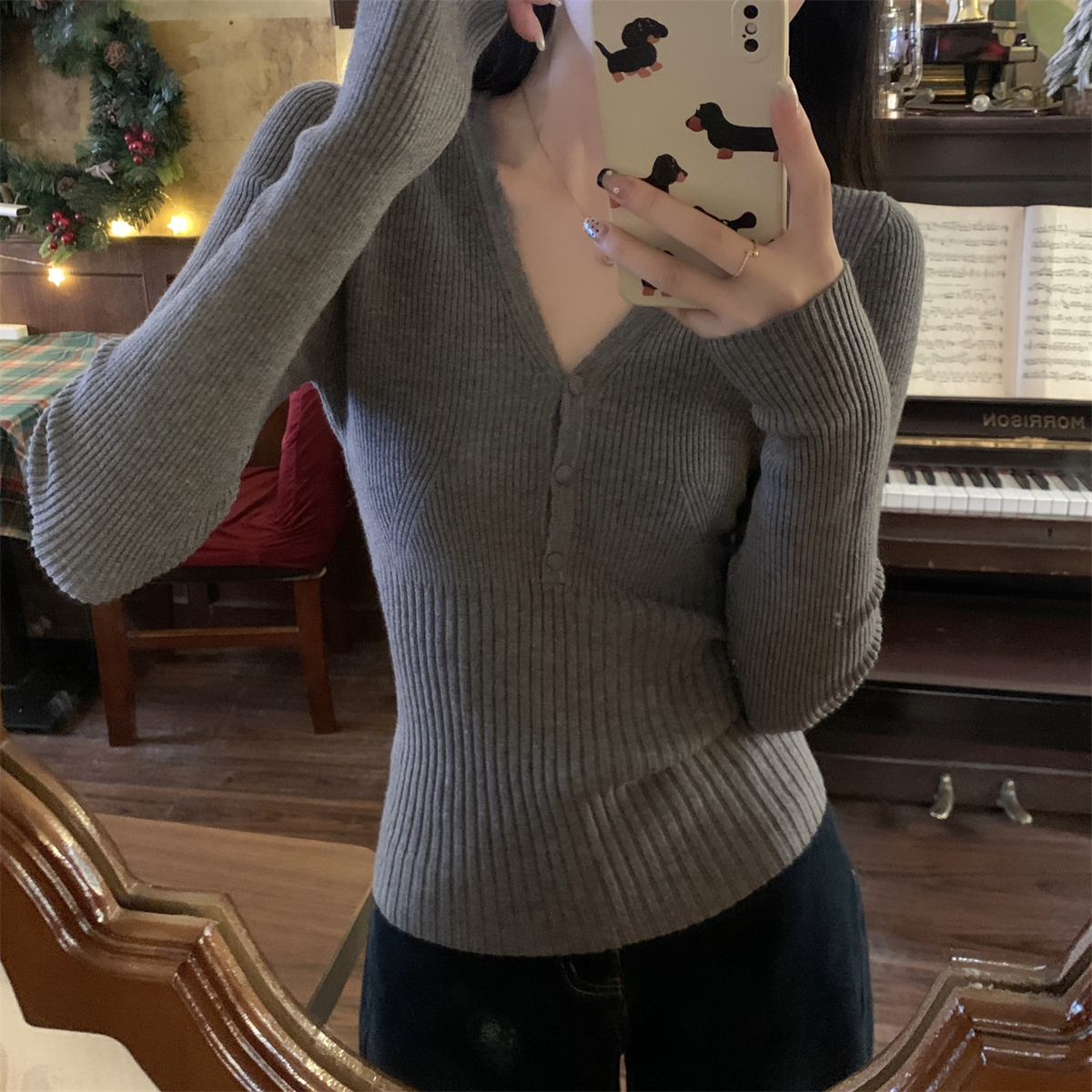 2025秋冬新款半开V领打底衫女内搭纽扣设计感修身低领针织上衣女