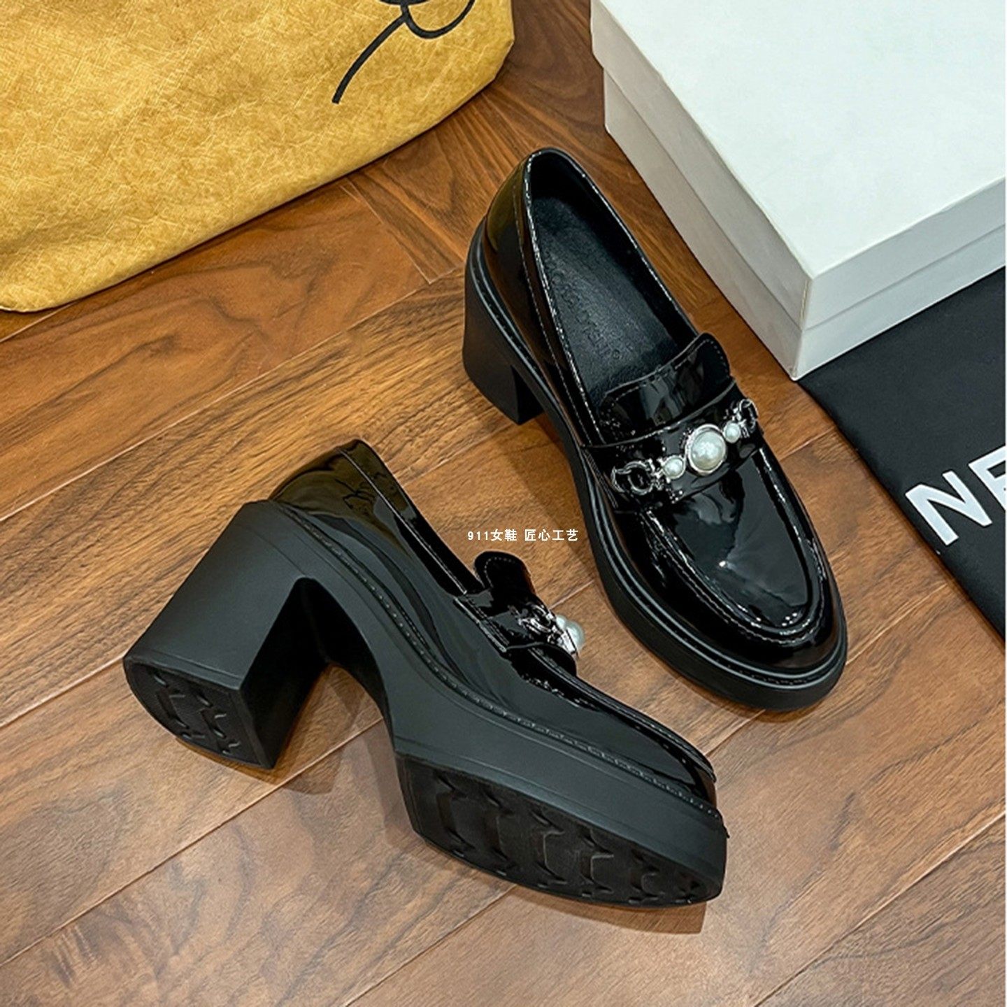 牛皮版~英伦圆头乐福鞋女春秋休闲厚底珍珠小皮鞋一脚蹬粗跟单鞋