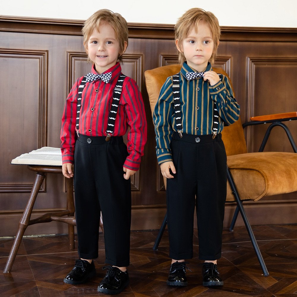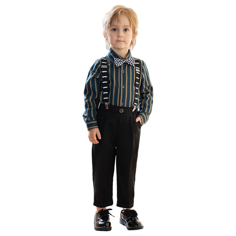 儿童礼服男童春秋款英伦条纹长袖背带裤套装中小童钢琴主持演出服