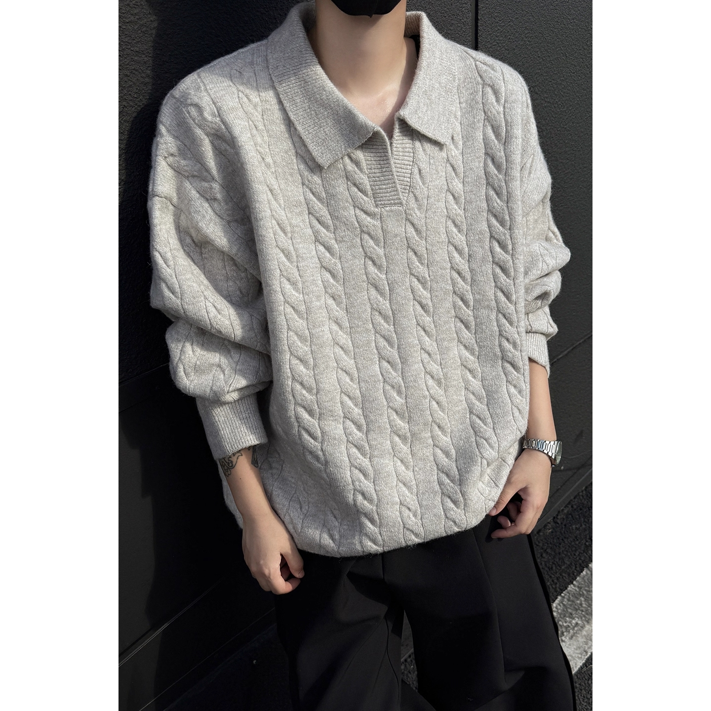 春秋复古风翻领假两件绞花纹毛衣男宽松百搭休闲纯色男女针织衫