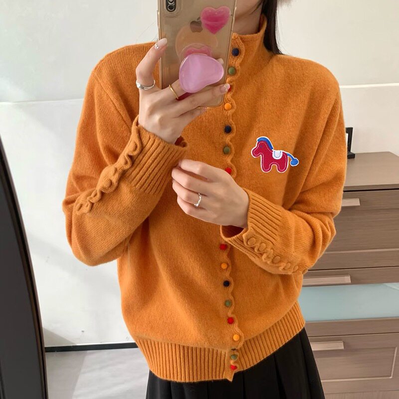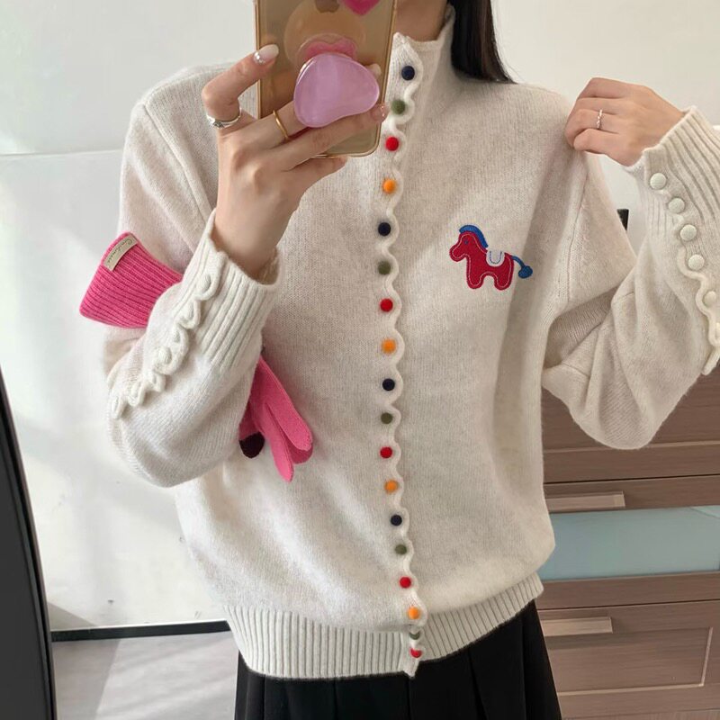 2026新款彩扣立领气质100%纯羊毛针织开衫女减龄红色针织毛衣外套