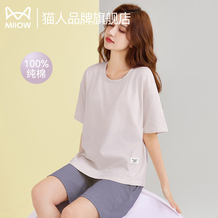 猫人纯棉睡衣女夏季2025新款薄款短袖短裤套装大码宽松外穿家居服