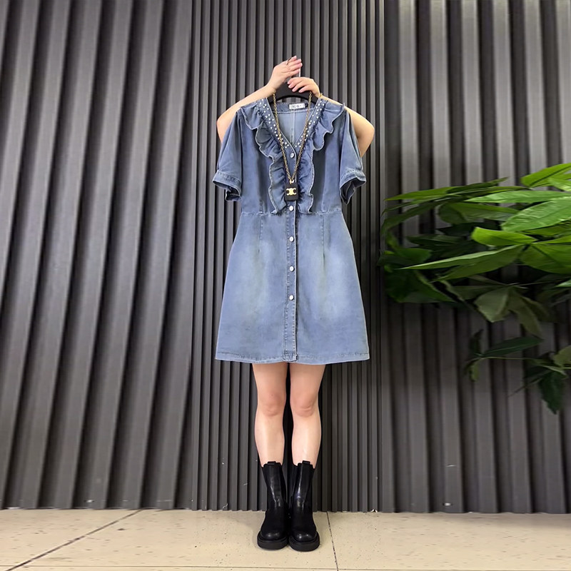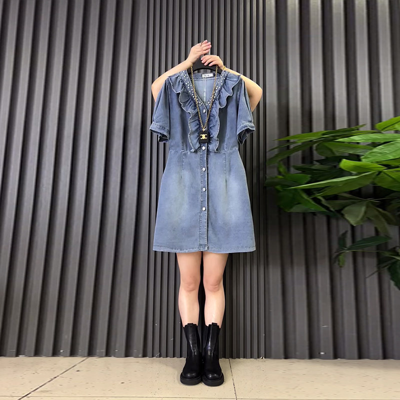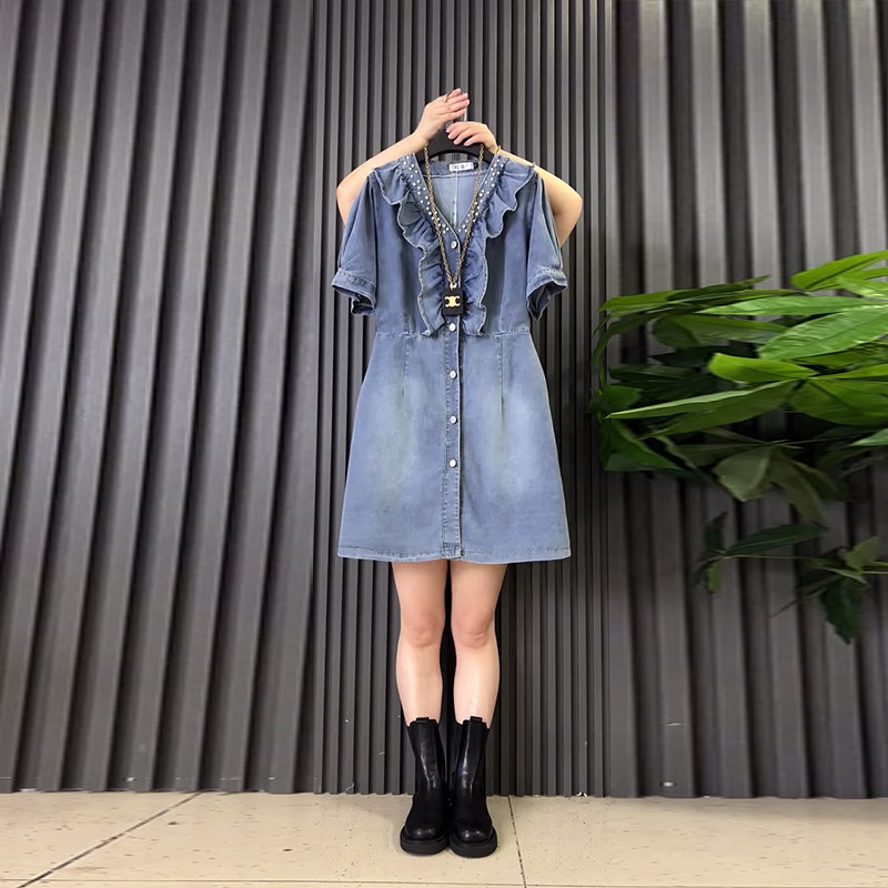 裙子V领荷叶边收腰牛仔连衣裙