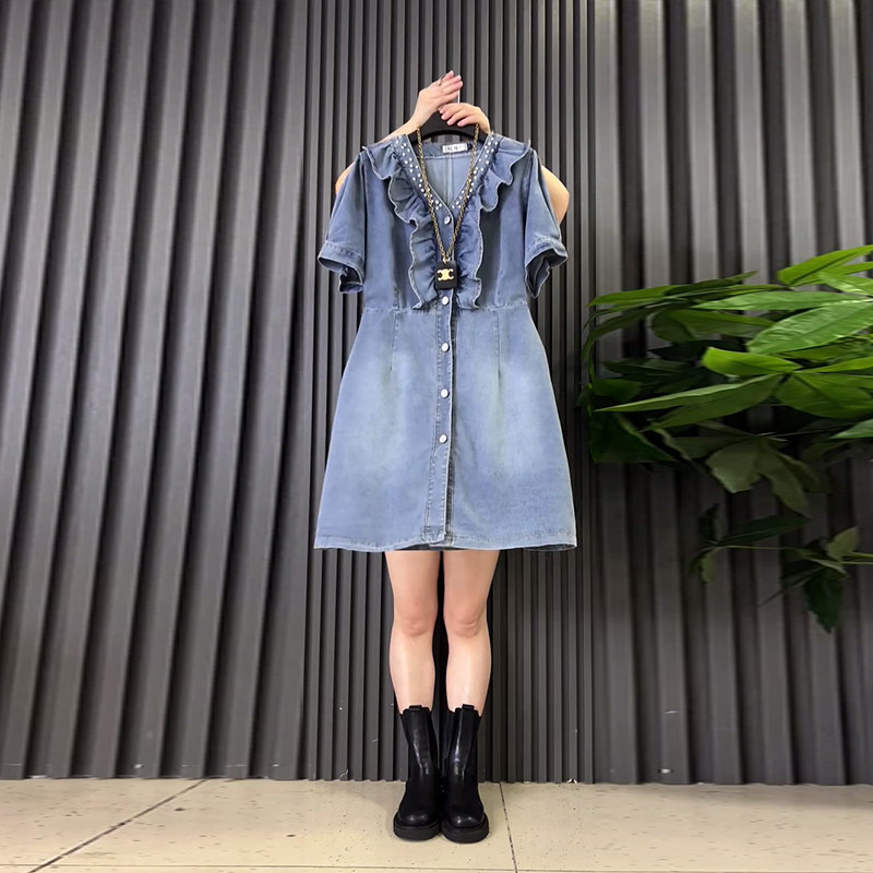 大码女装V领荷叶边短袖收腰牛仔连衣裙胖MM夏季款欧货洋气休闲裙