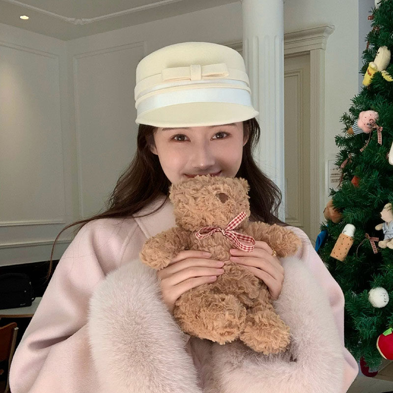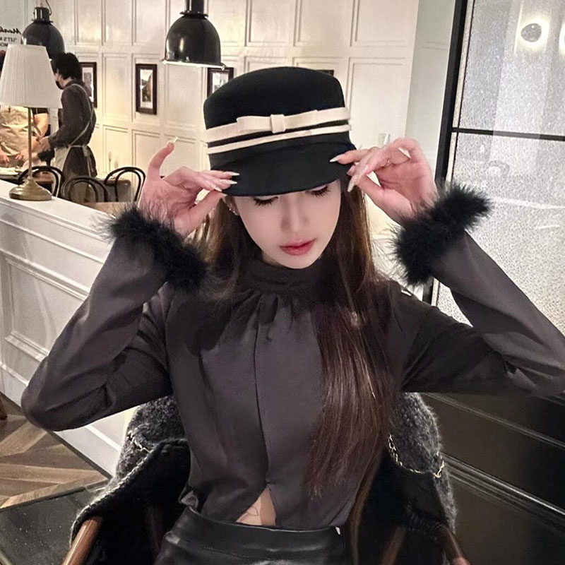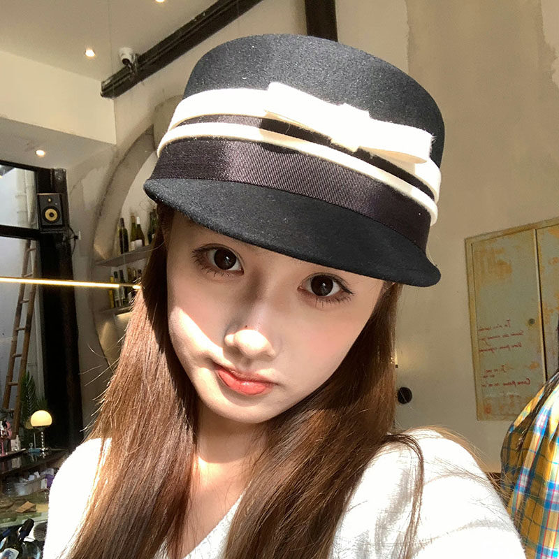 秋冬新款黑色羊毛呢帽子马术帽女士撞色蝴蝶结时装帽保暖平顶毡帽