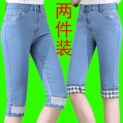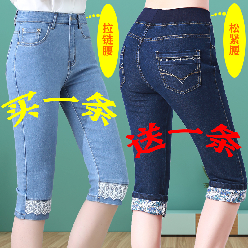 夏季高腰七分牛仔裤女新款宽松弹力松紧腰中裤大码修身显瘦裤子女