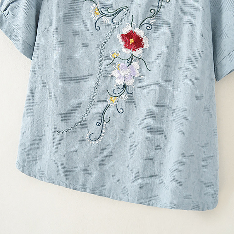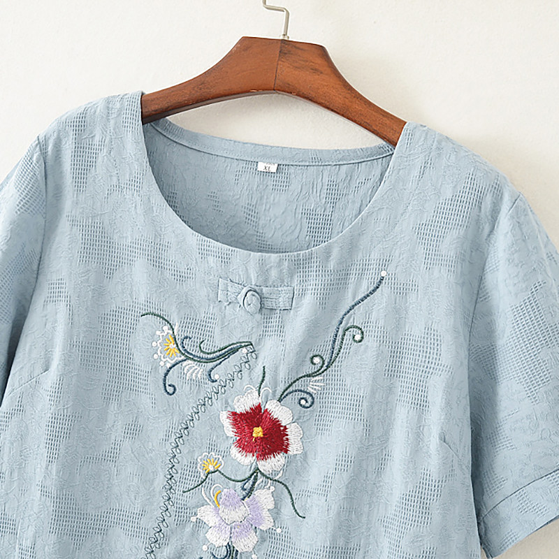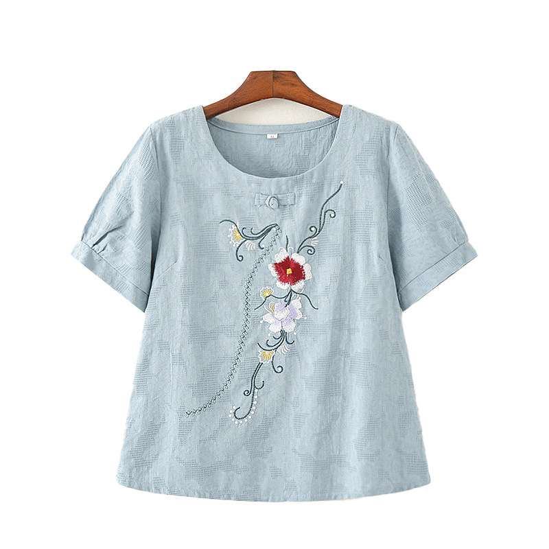 绣花提花短袖T恤棉麻盘扣圆领夏季上衣老年女装加大码夏装妈妈装