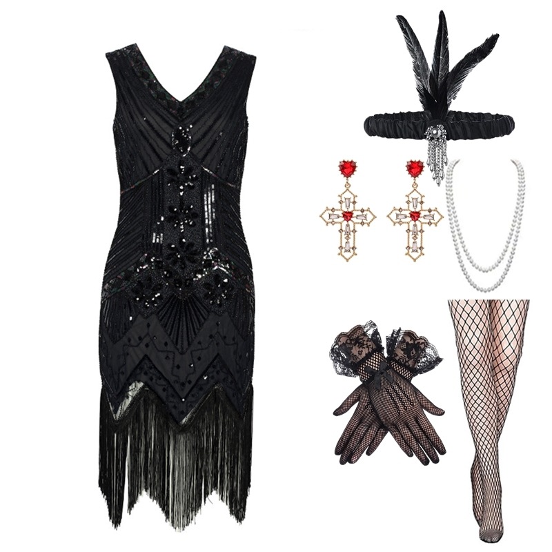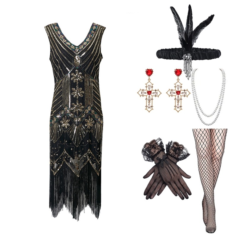 1920s欧美盖茨比晚礼服流苏 大码V领连衣裙套装宴会外贸