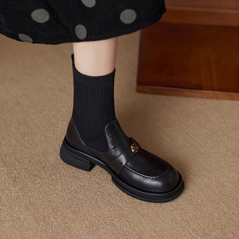 真皮圆头山茶花针织弹力瘦瘦靴女平底2025秋冬舒适粗跟乐福鞋短靴