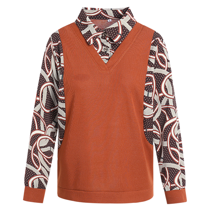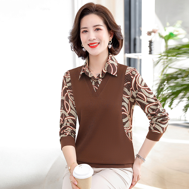 中老年女装洋气上衣假两件打底衫女士长袖T恤衬衫春秋新款套头衫