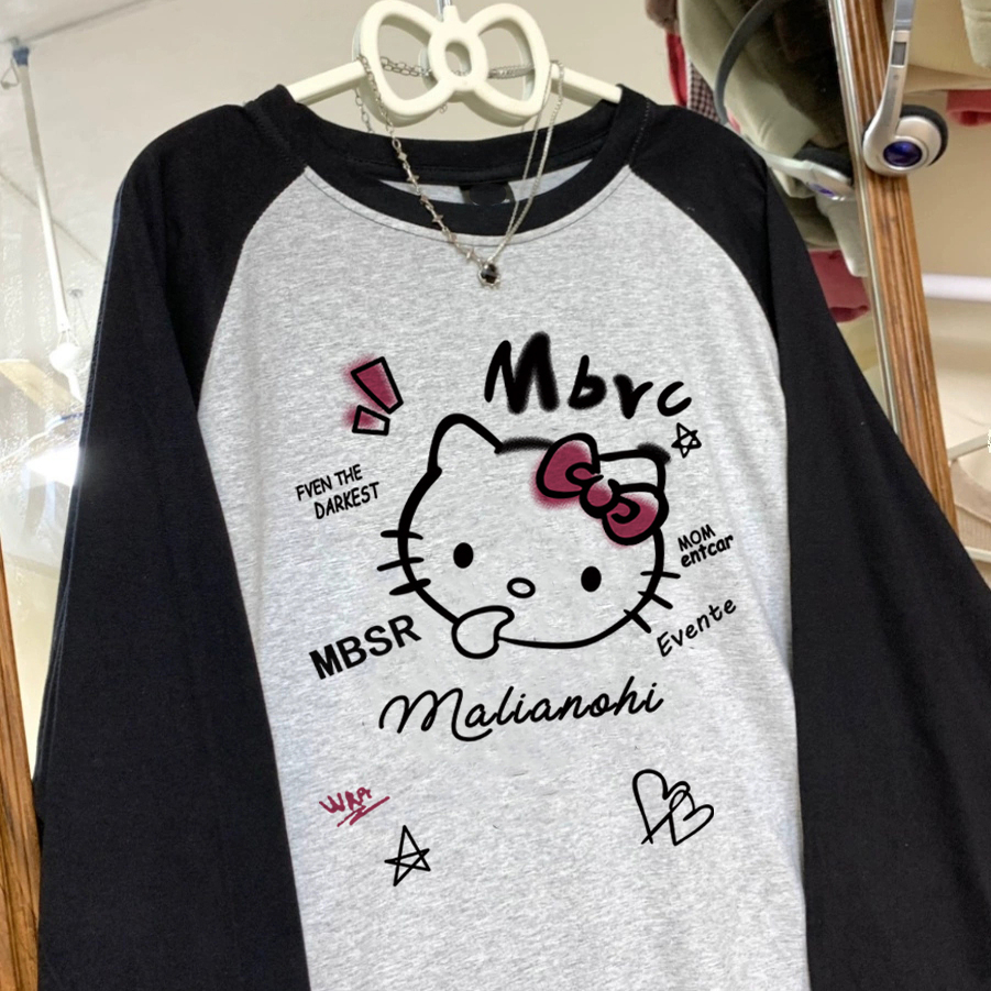 大码kitty猫日系复古纯棉拼色T恤女长袖240斤胖MM秋冬打底衫上衣