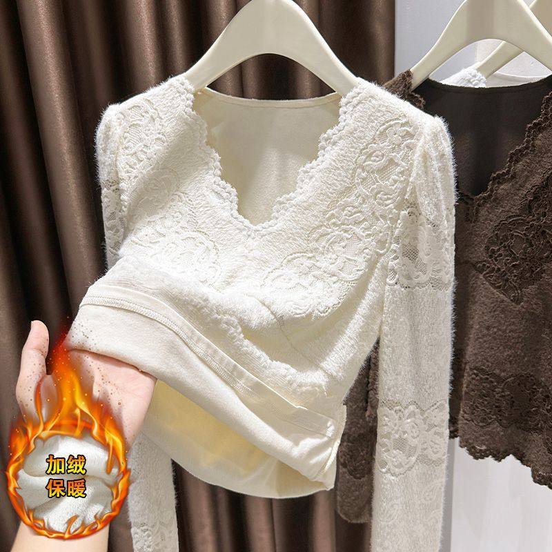 大码加绒加厚蕾丝打底衫女裝胖mm秋冬季V领磨毛叠穿保暖内搭上衣