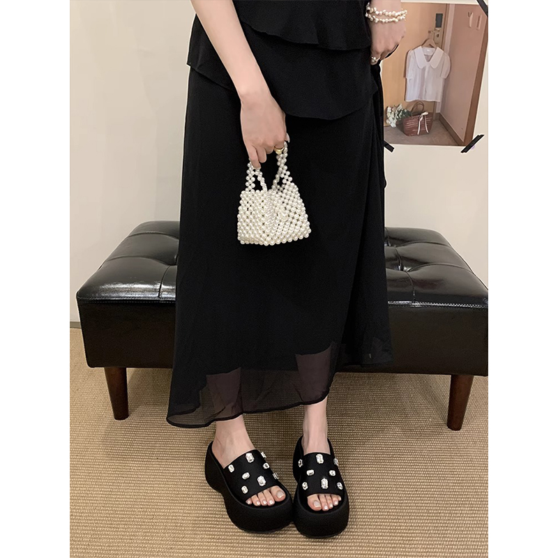 厚底凉拖鞋夏2025新款高级感水钻一字带配裙子半拖增高休闲松糕鞋