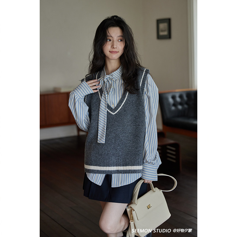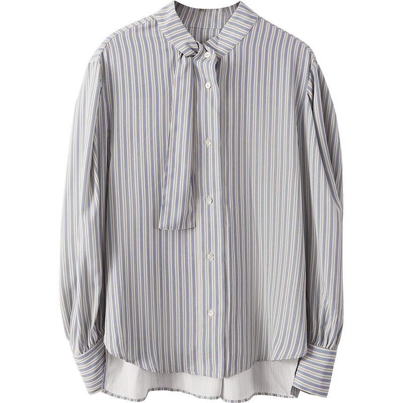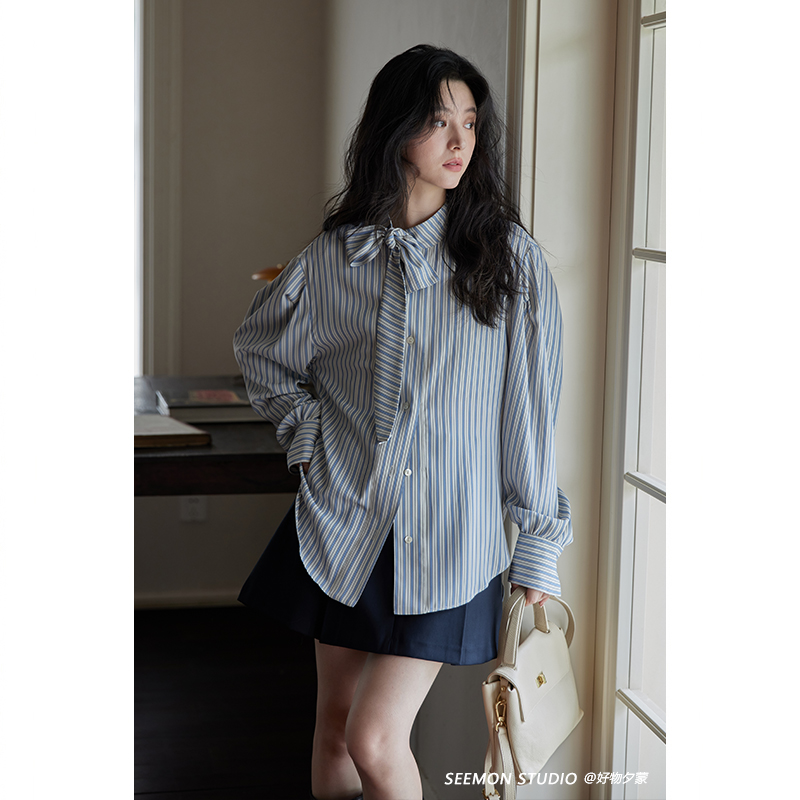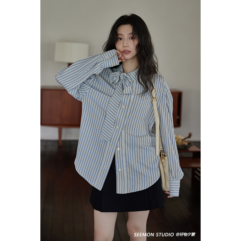 夕蒙2025新款秋长袖设计感小众法式别致系带条纹衬衫上衣外套女