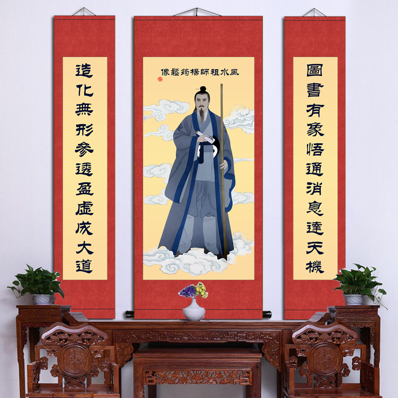 极速杨筠松画g像风水祖师爷挂画堂屋三联画客厅办公装饰画丝绸卷