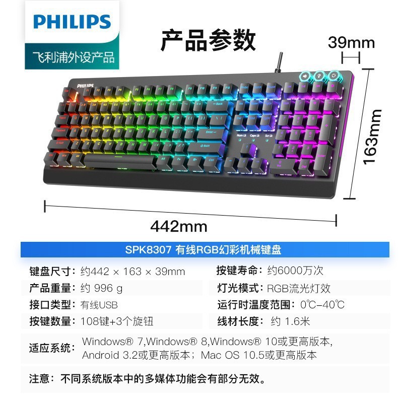 Philips/飞利浦SPK8307金属面板青轴机械游戏吃鸡电脑USB有线键盘