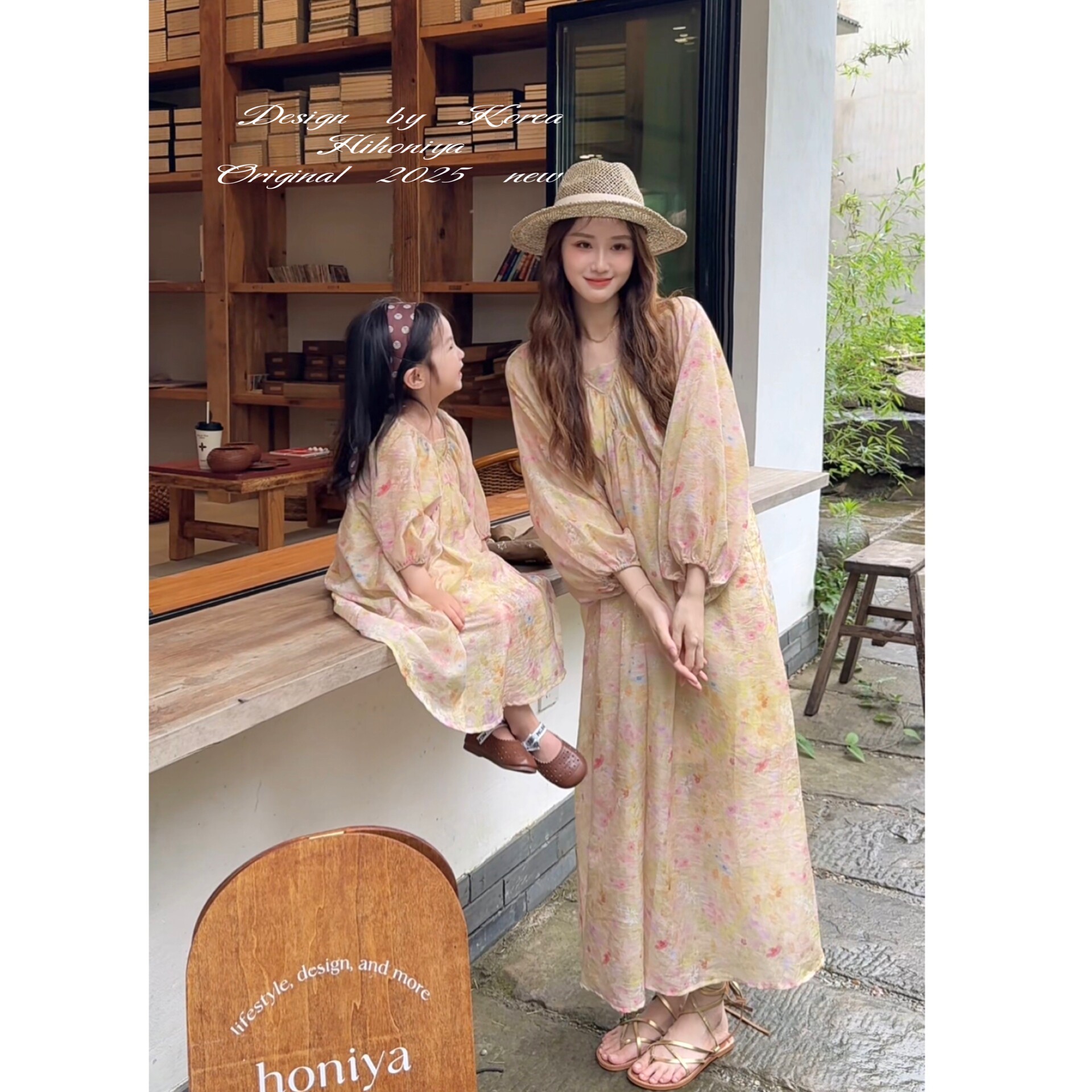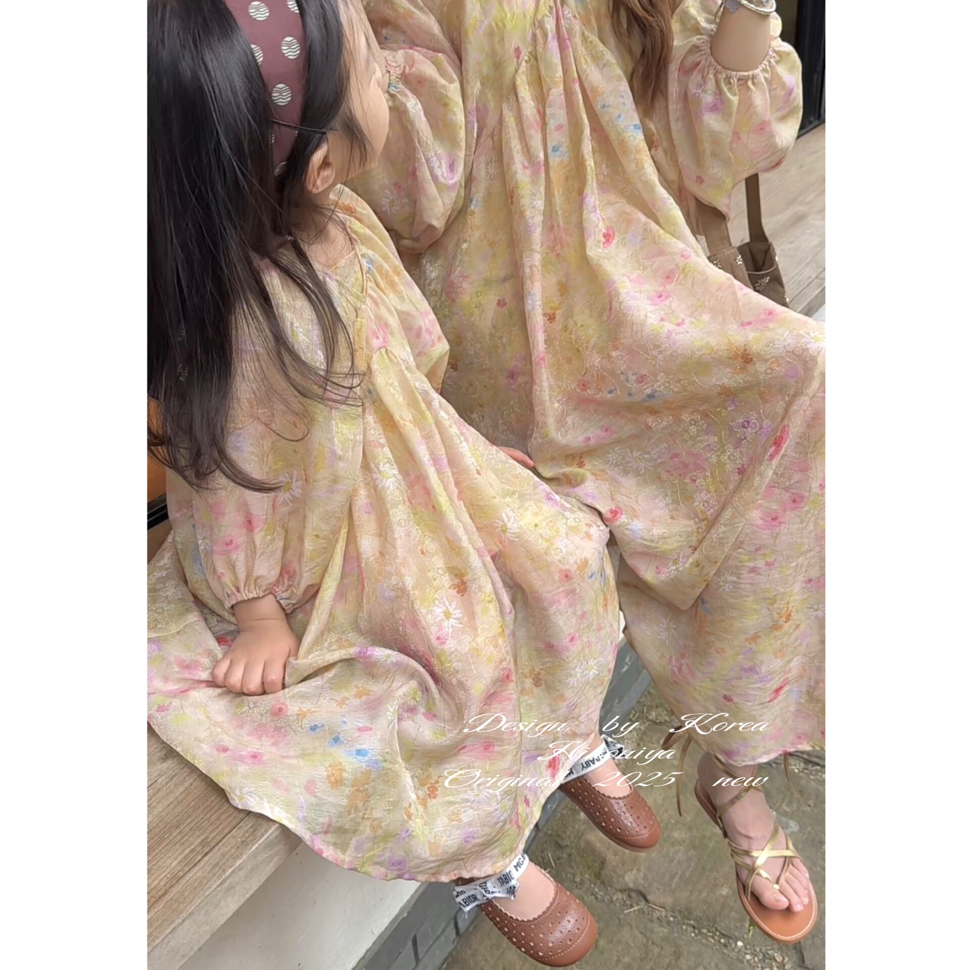 Spring韩国童装2025夏季新款亲子法式压皱设计连衣裙女童长袖裙子