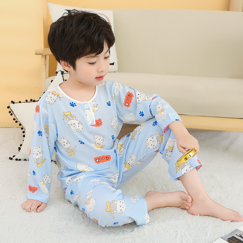 夏季儿童绵绸睡衣男童女童春季薄款长袖棉绸家居空调服男女孩套装