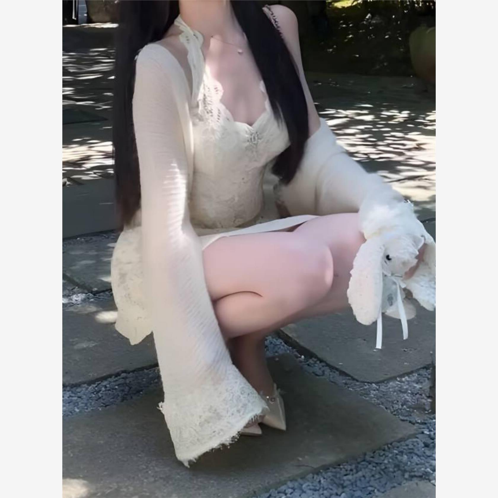 纯欲风甜美短裙秋季收腰显瘦蕾丝性感无袖挂脖连衣裙+开衫套装女