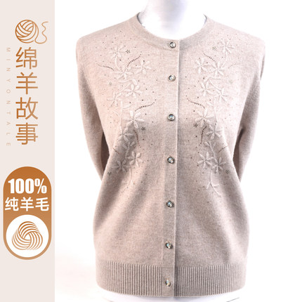 中老年时尚女装100%纯羊毛衫妈妈针织开衫秋冬季高贵保暖毛衣外套