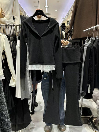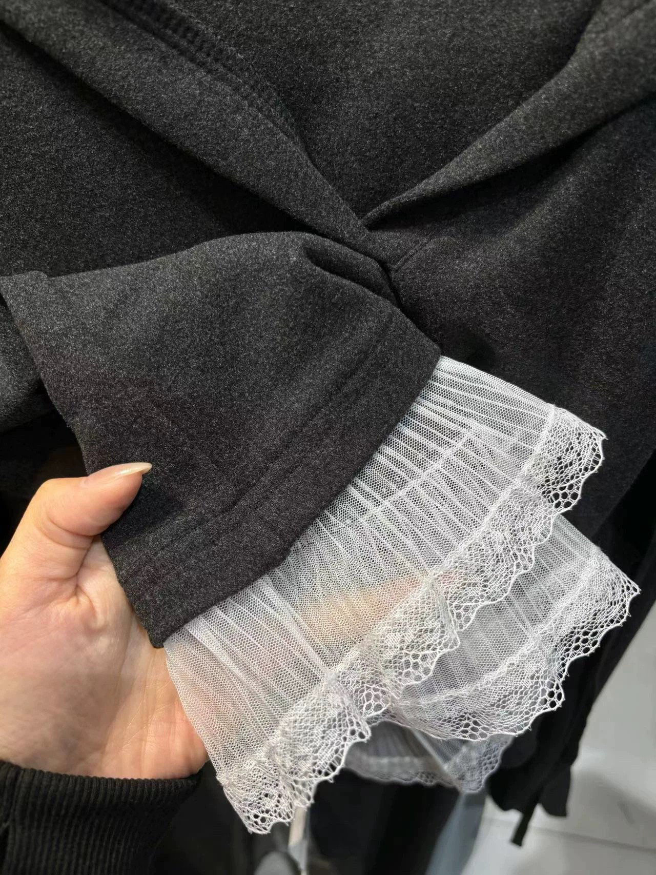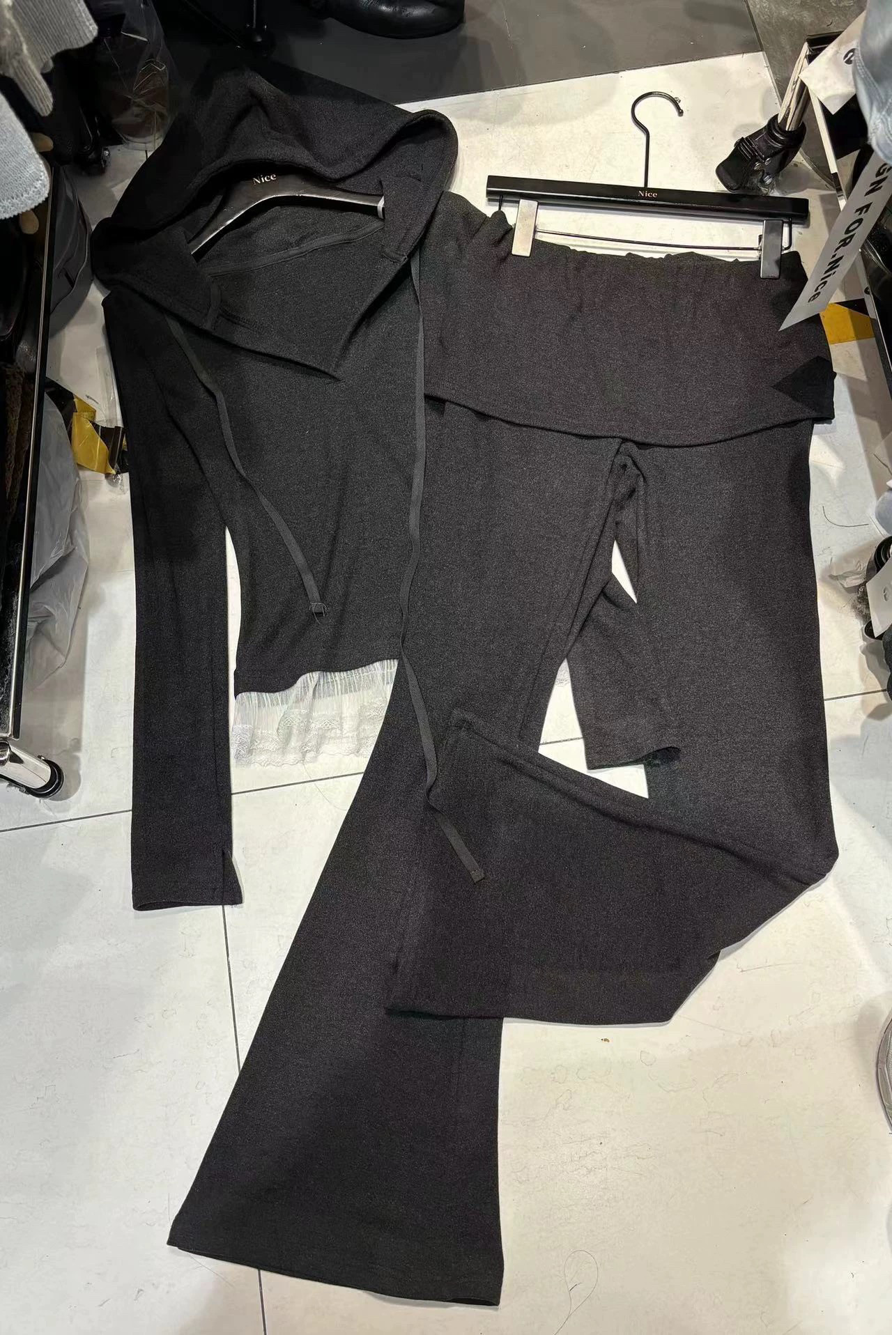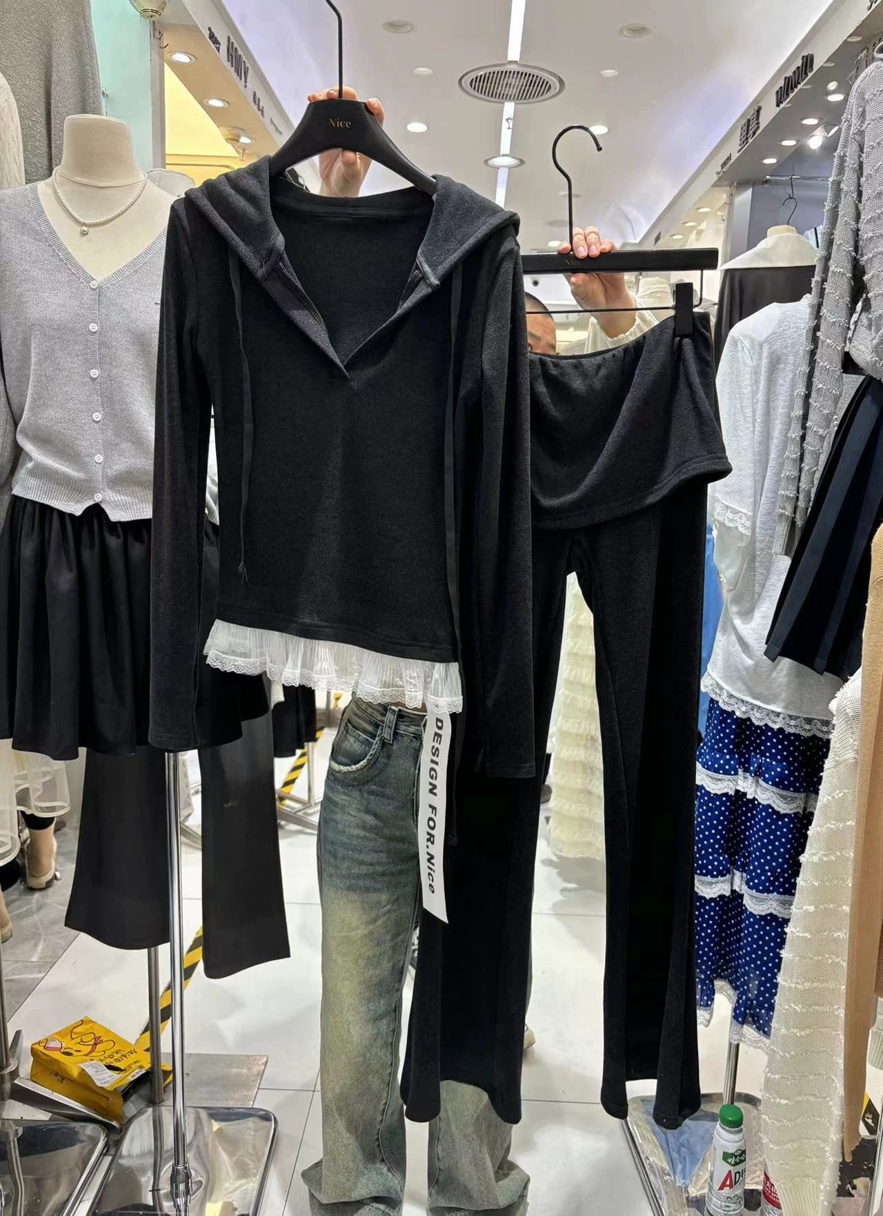 nice乃思儿2025新款洋气设计气质蕾丝连帽长袖上衣显瘦裤子套装女