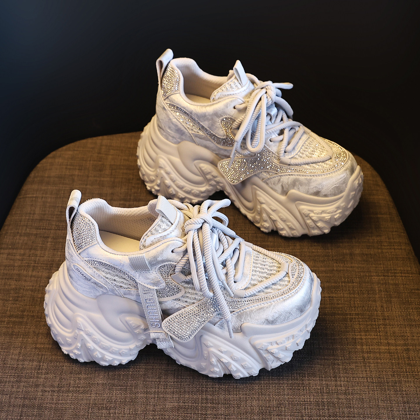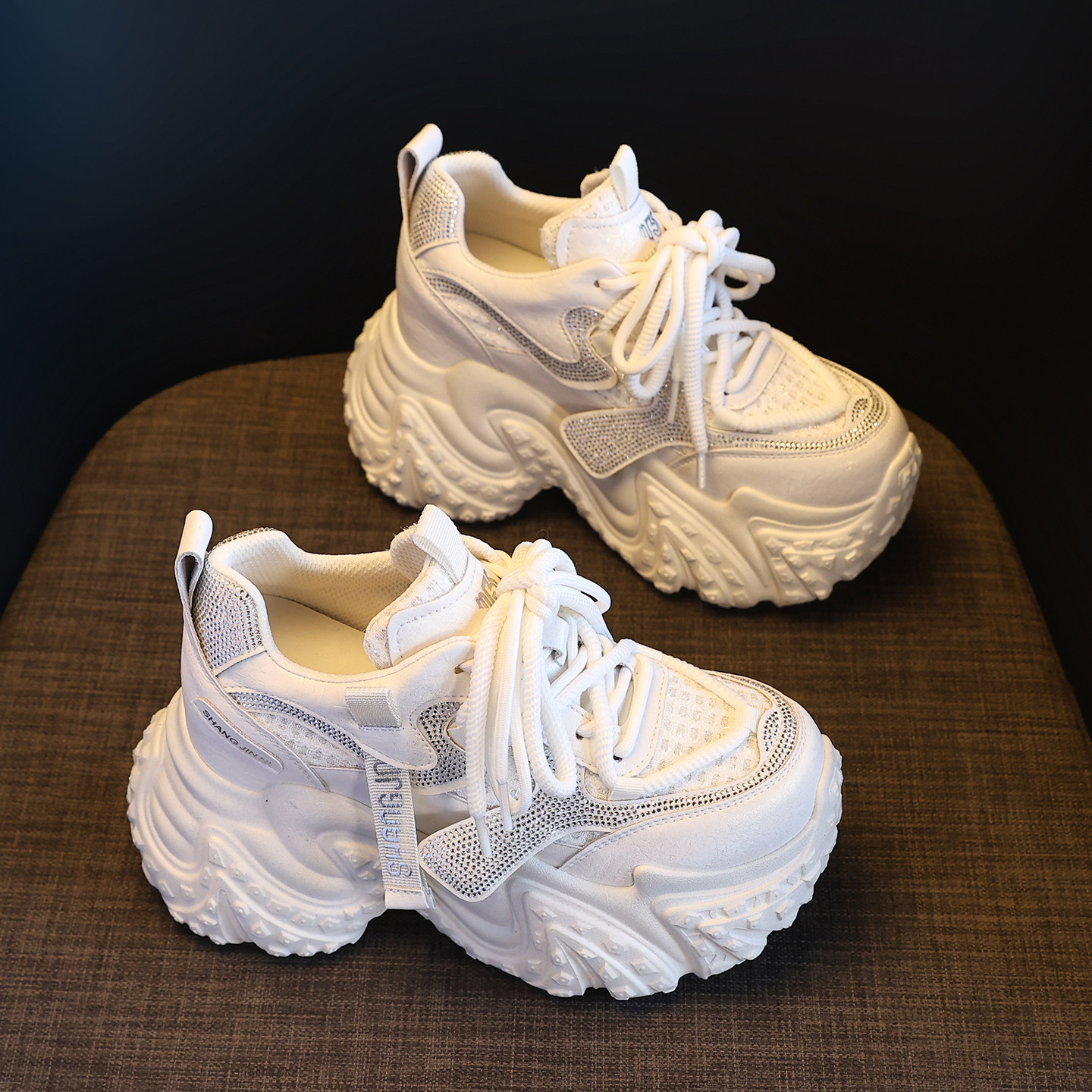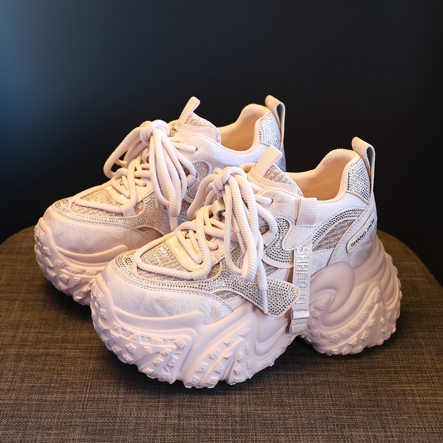 粉色厚底老爹鞋女水钻9cm休闲鞋