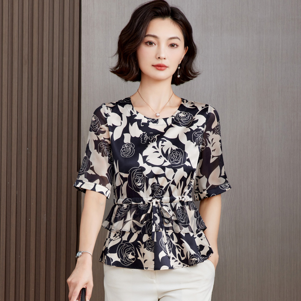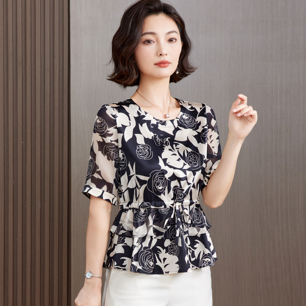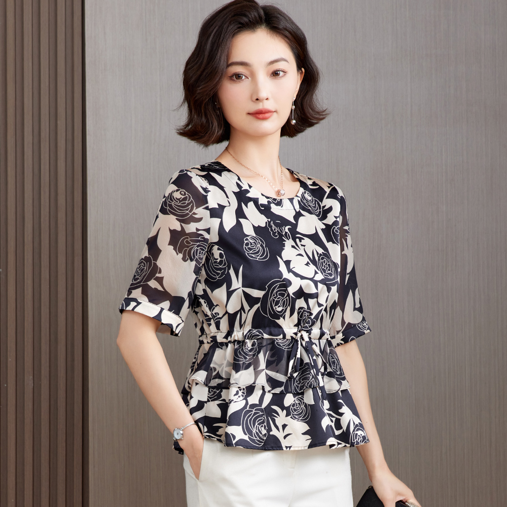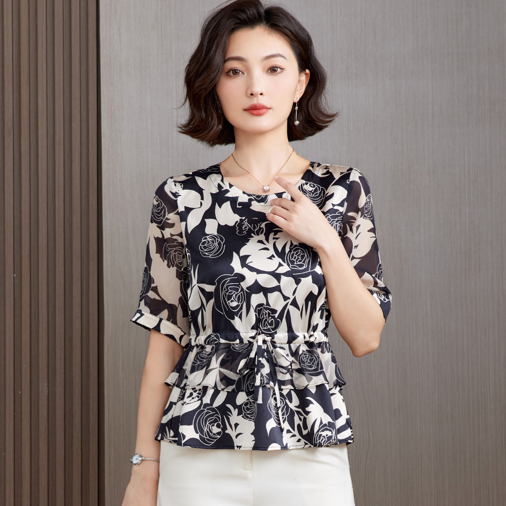 2025夏重磅真丝衬衫女短袖洋气显瘦圆领复古印花品牌桑蚕丝上衣女