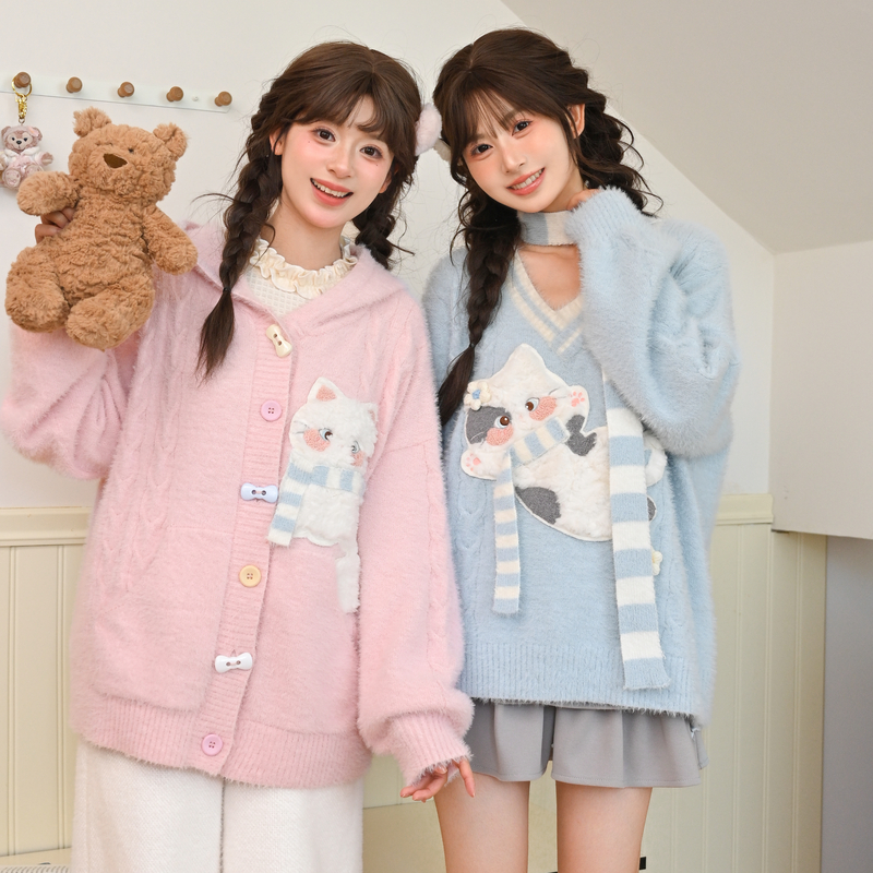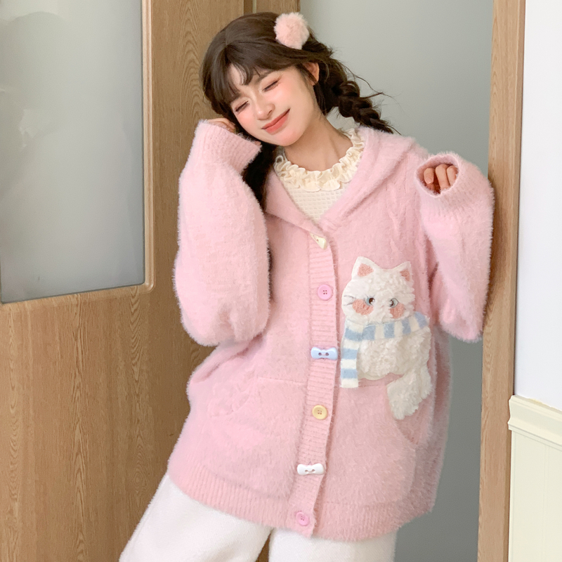 森女部落甜美可爱粉色针织开衫女长袖上衣2025新款秋连帽毛衣外套