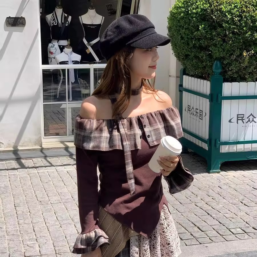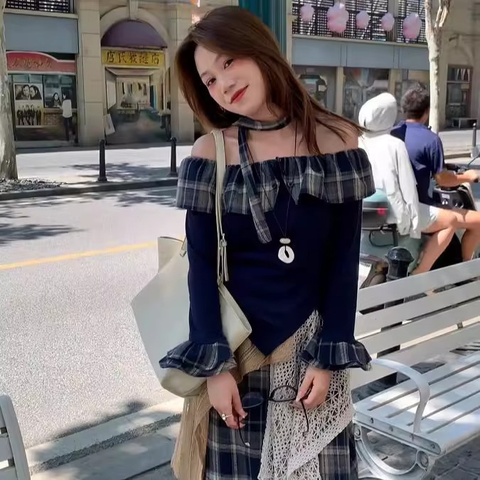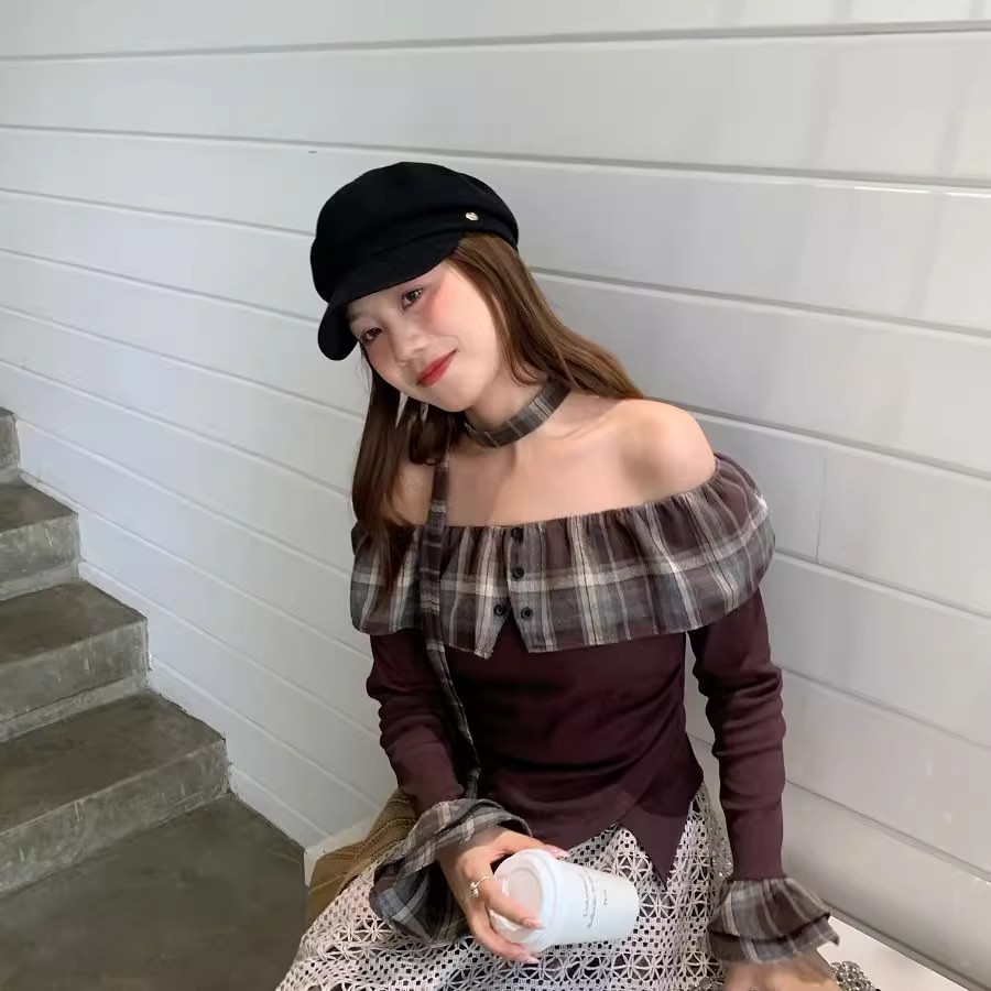 微胖波西米亚复古一字肩格子长袖套装女秋季新款蕾丝半身裙两件套