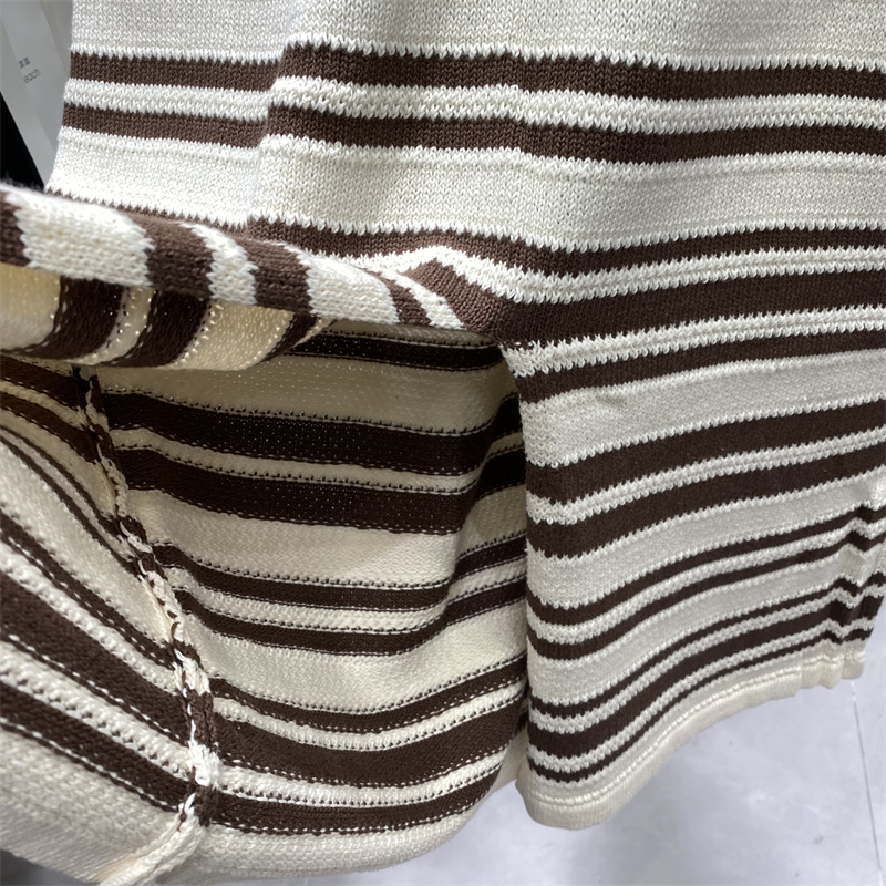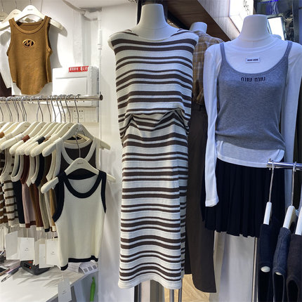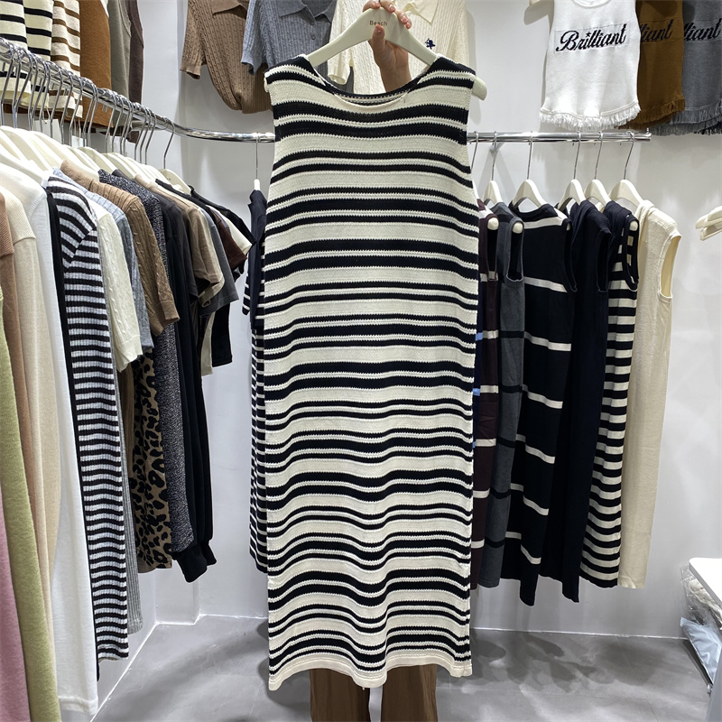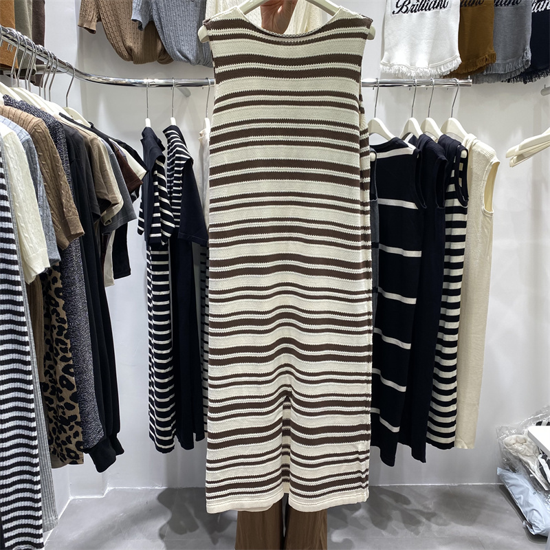 条纹吊带连衣裙开叉针织背心长裙