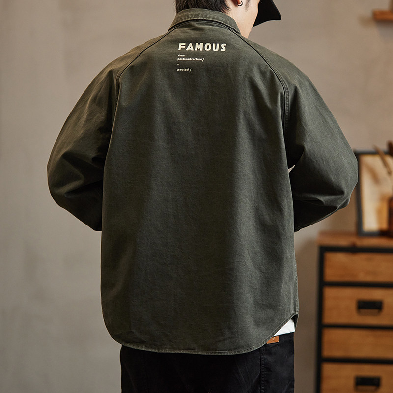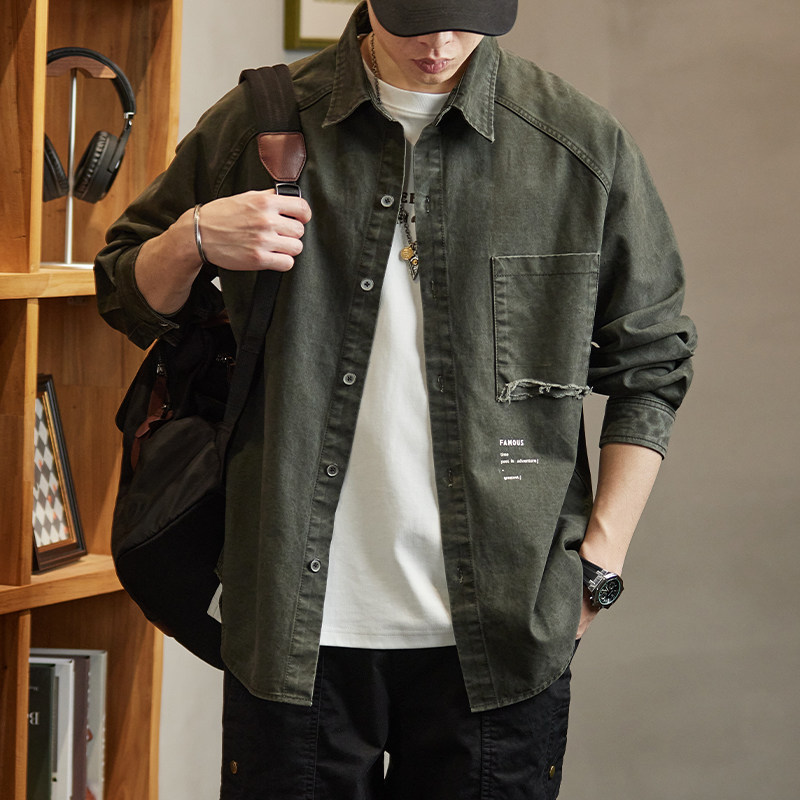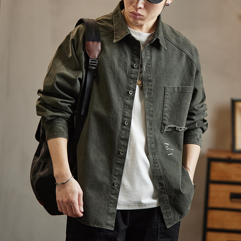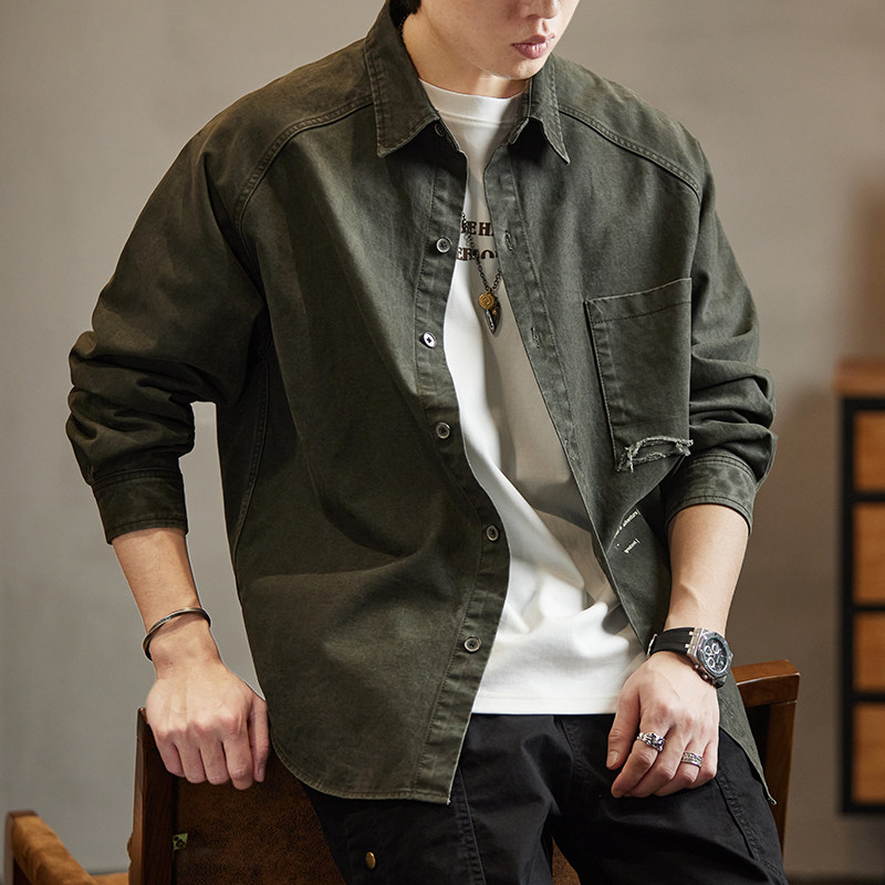 美式重磅复古纯棉牛仔衬衫男士春季新款潮牌工装口袋长袖衬衣外套
