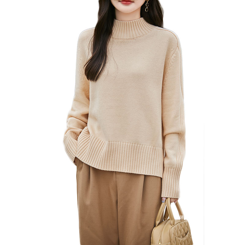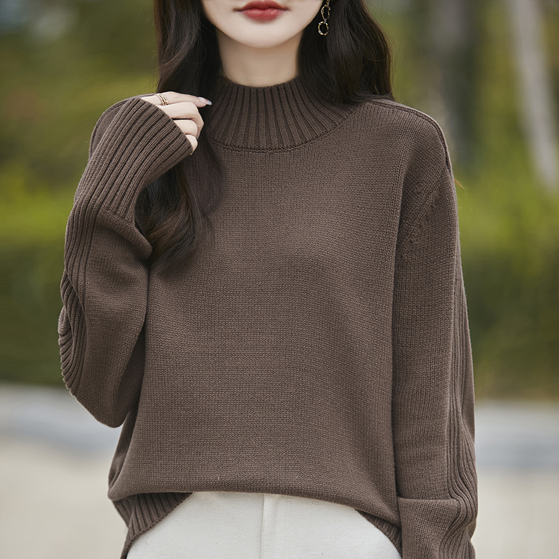 纯棉线半高领加厚针织衫女秋冬宽松显瘦慵懒风开叉毛衣纯色打底衫