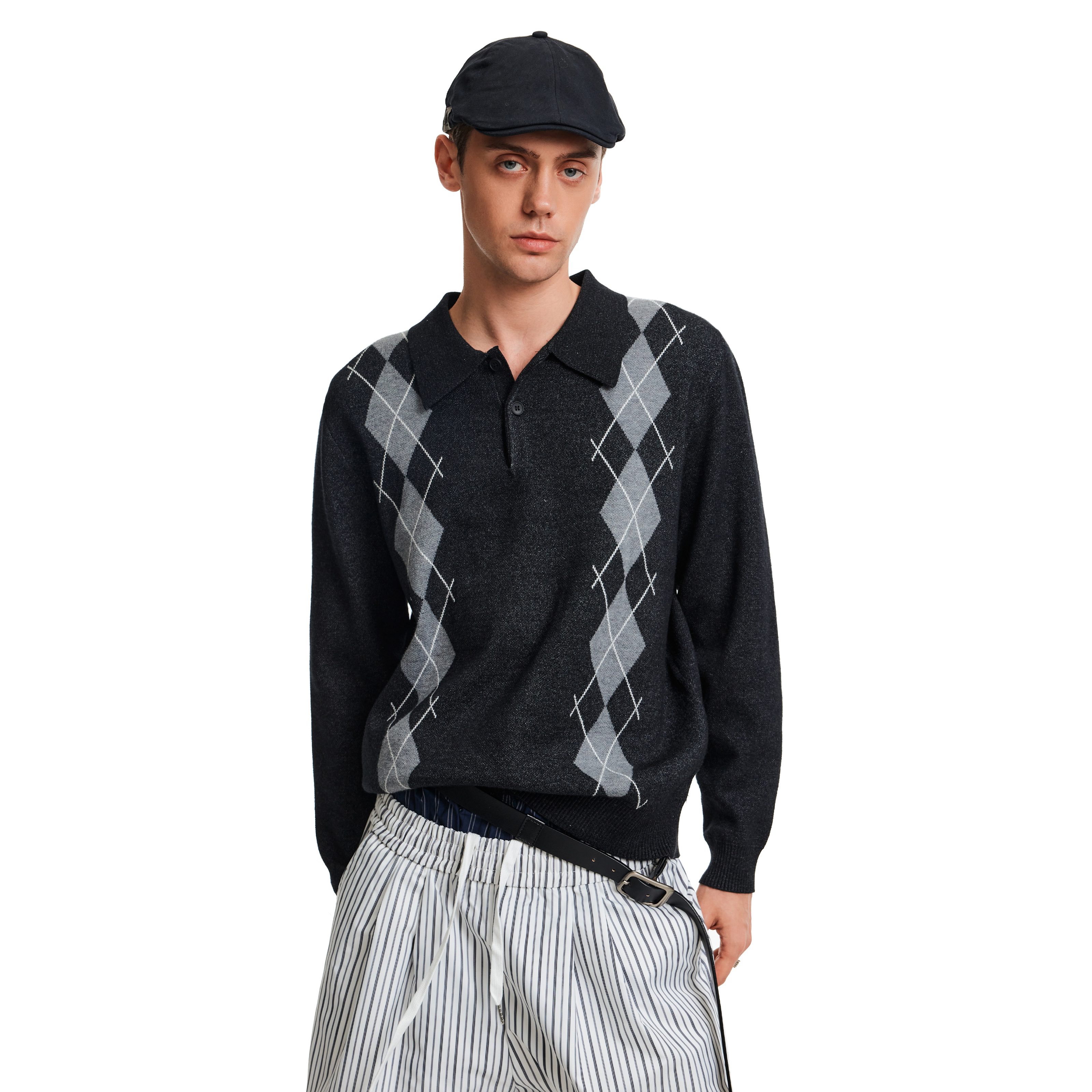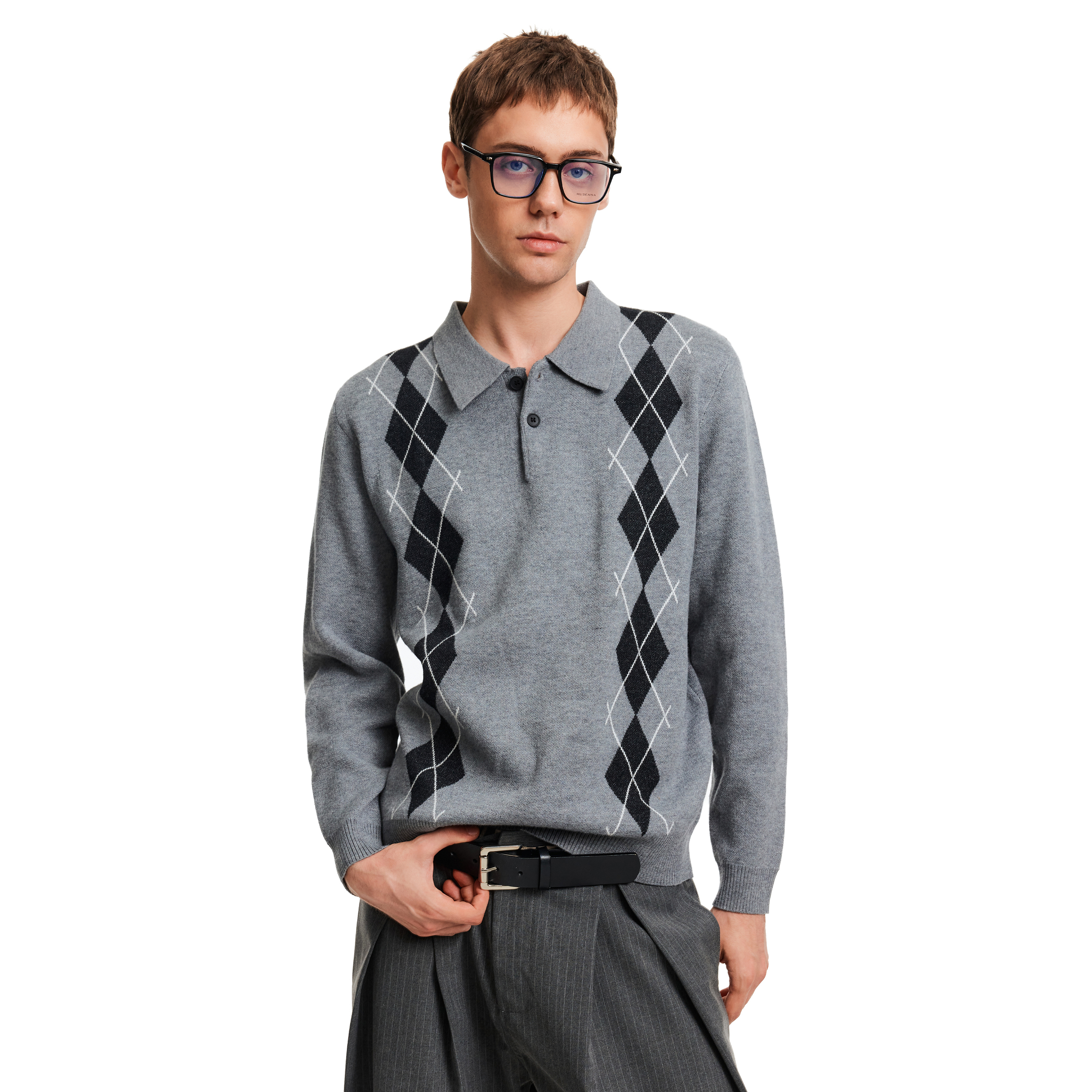 MADWITCH秋冬复古撞色菱格针织衫毛衣男女通勤休闲polo领套头上衣