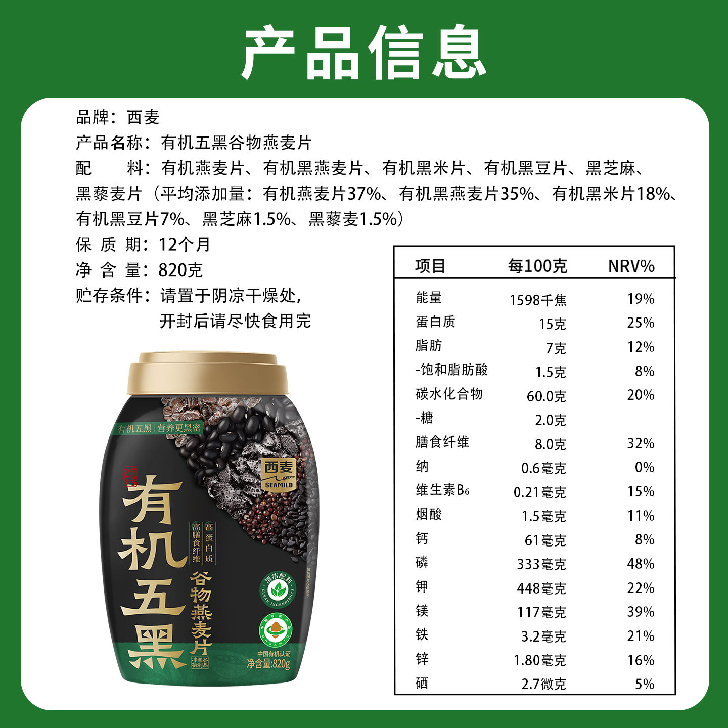 西麦有机五黑谷物燕麦片820*1桶饱腹代餐营养燕麦高蛋白有机早餐