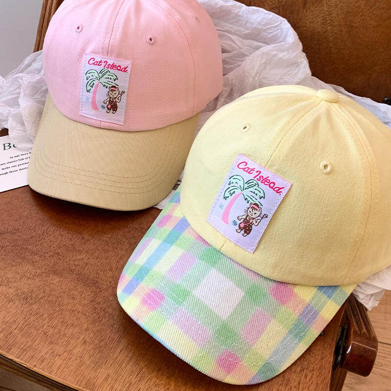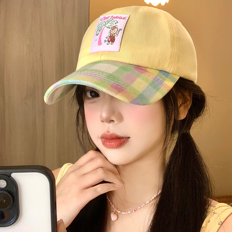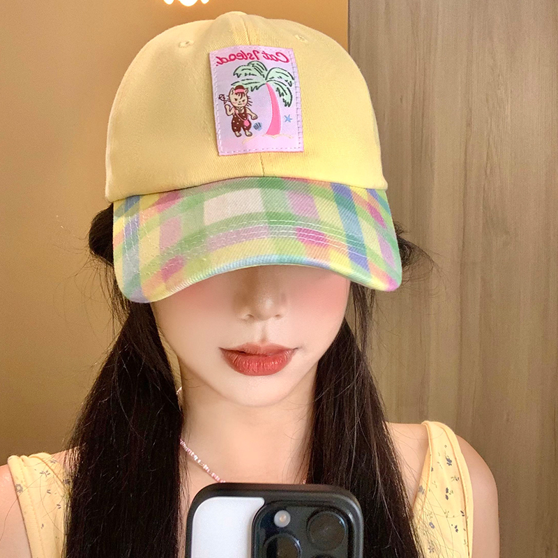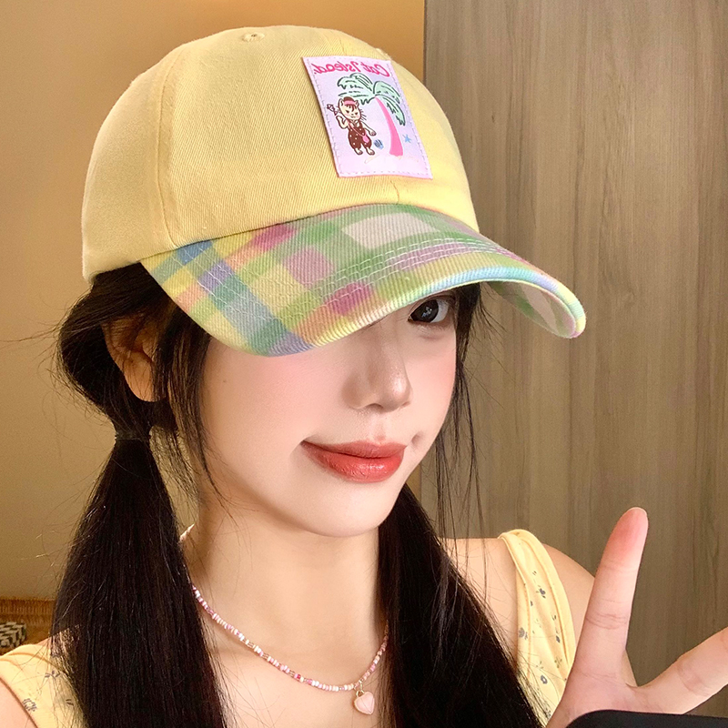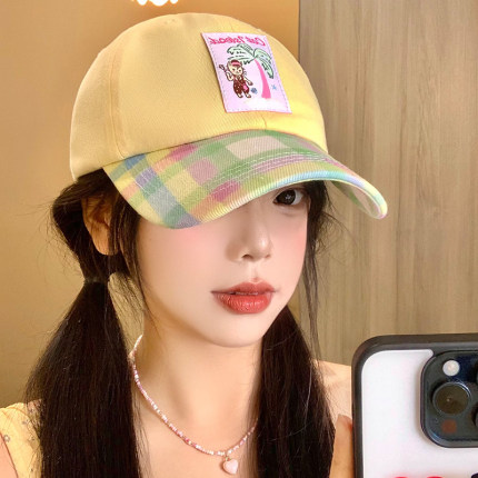 可爱刺绣彩色格子棒球帽女韩版百搭大头围鸭舌帽宽帽檐显脸小帽子