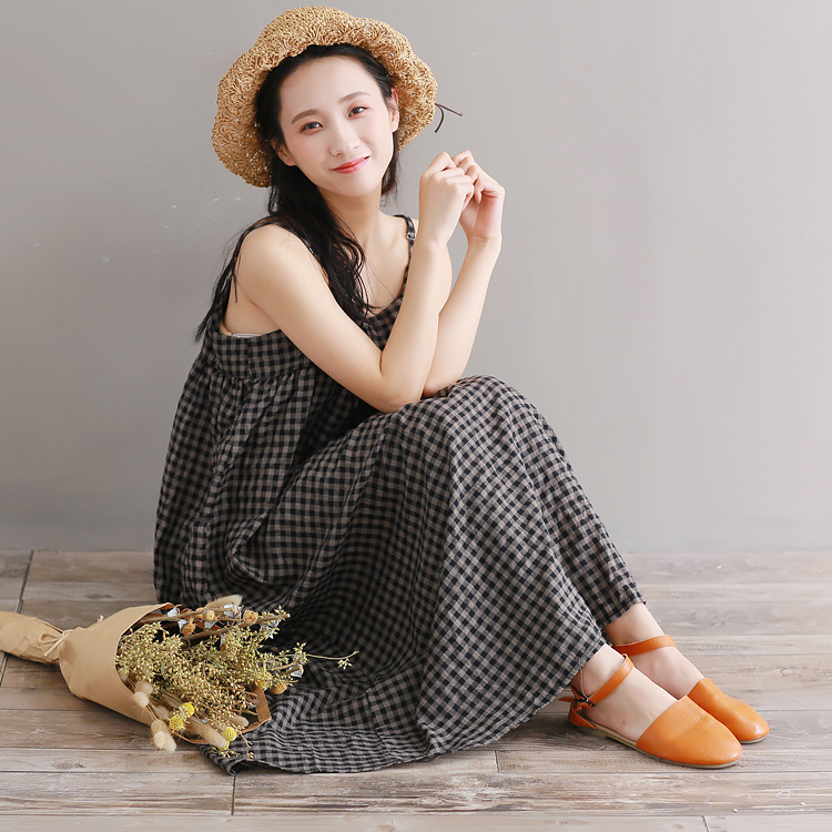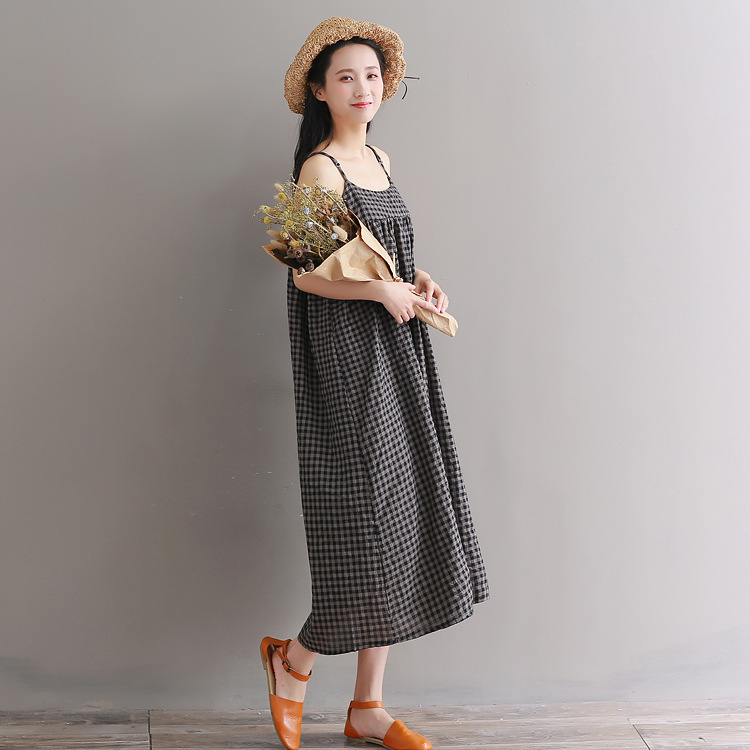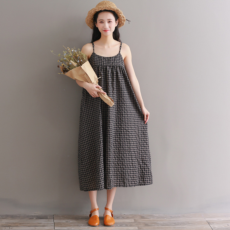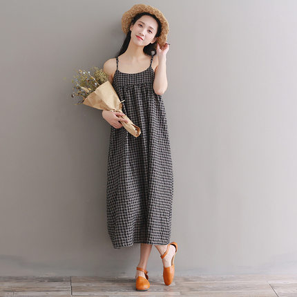 夏装新款女文艺宽松复古中长款宽松A字裙格子吊带裙连衣裙(勿拍)